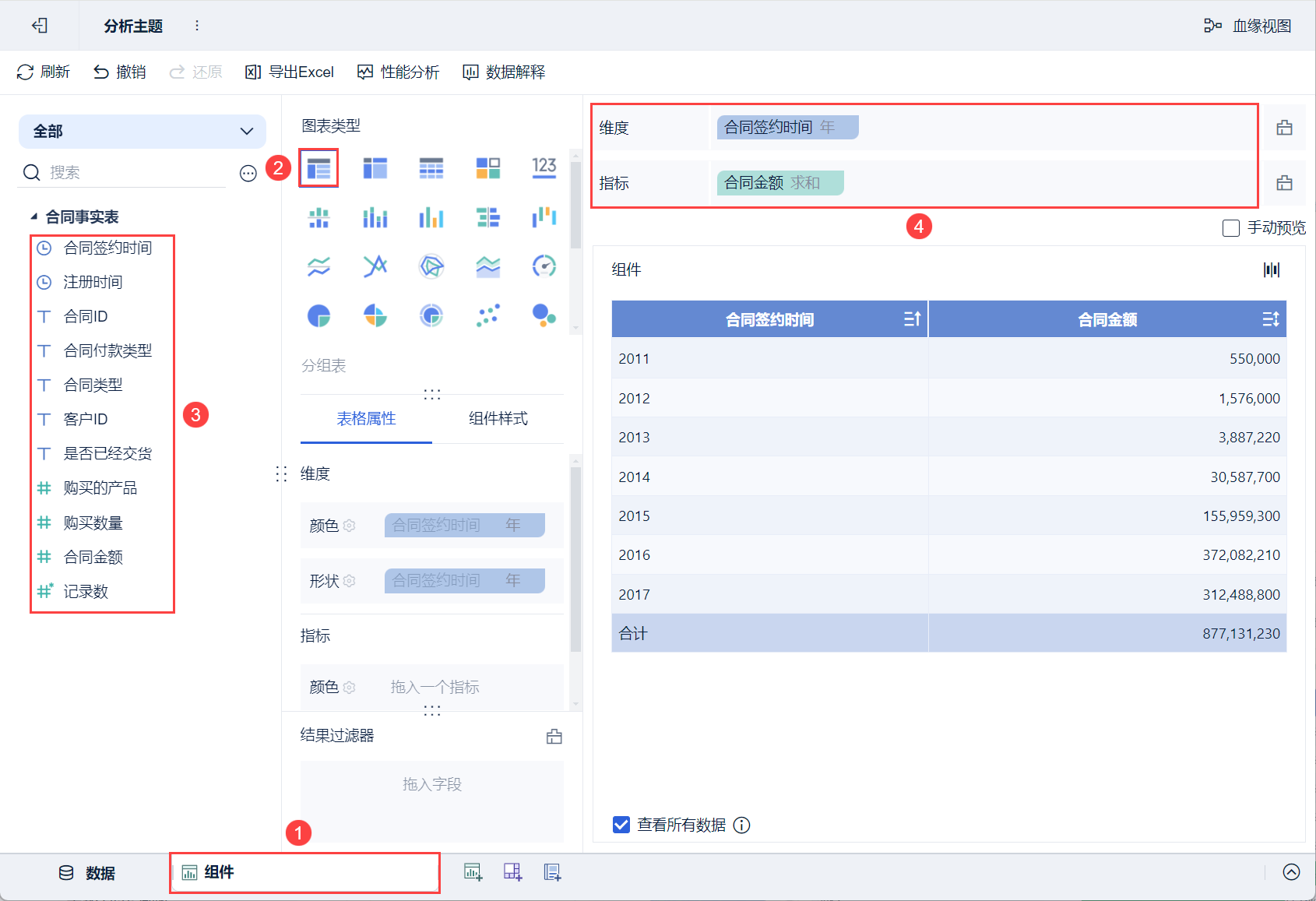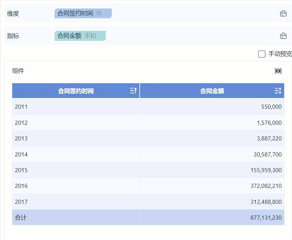 3)将待分析区域的「合同签约时间」拖入维度栏;「合同金额」拖入指标栏,如下图所示: