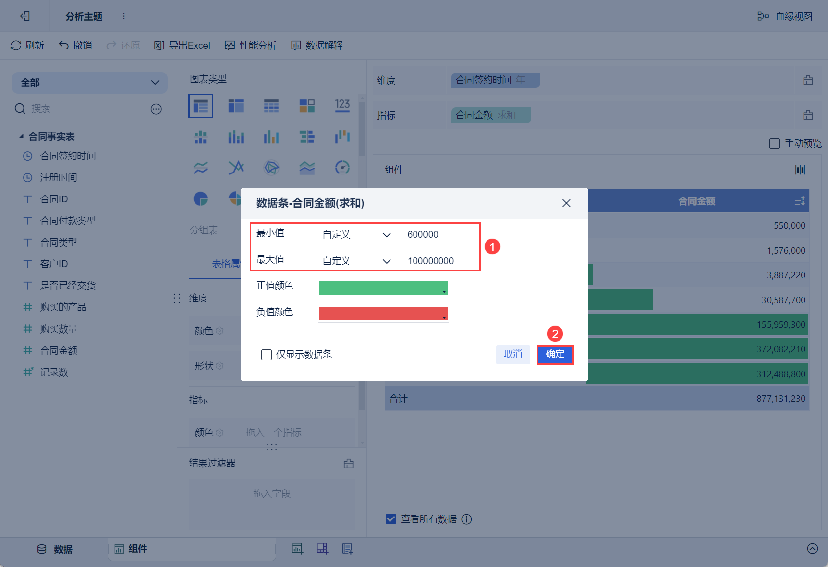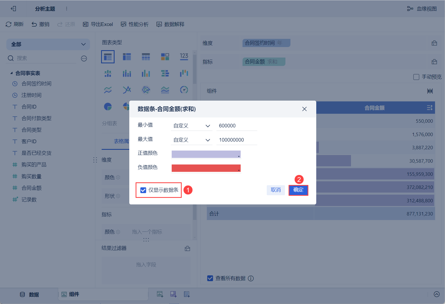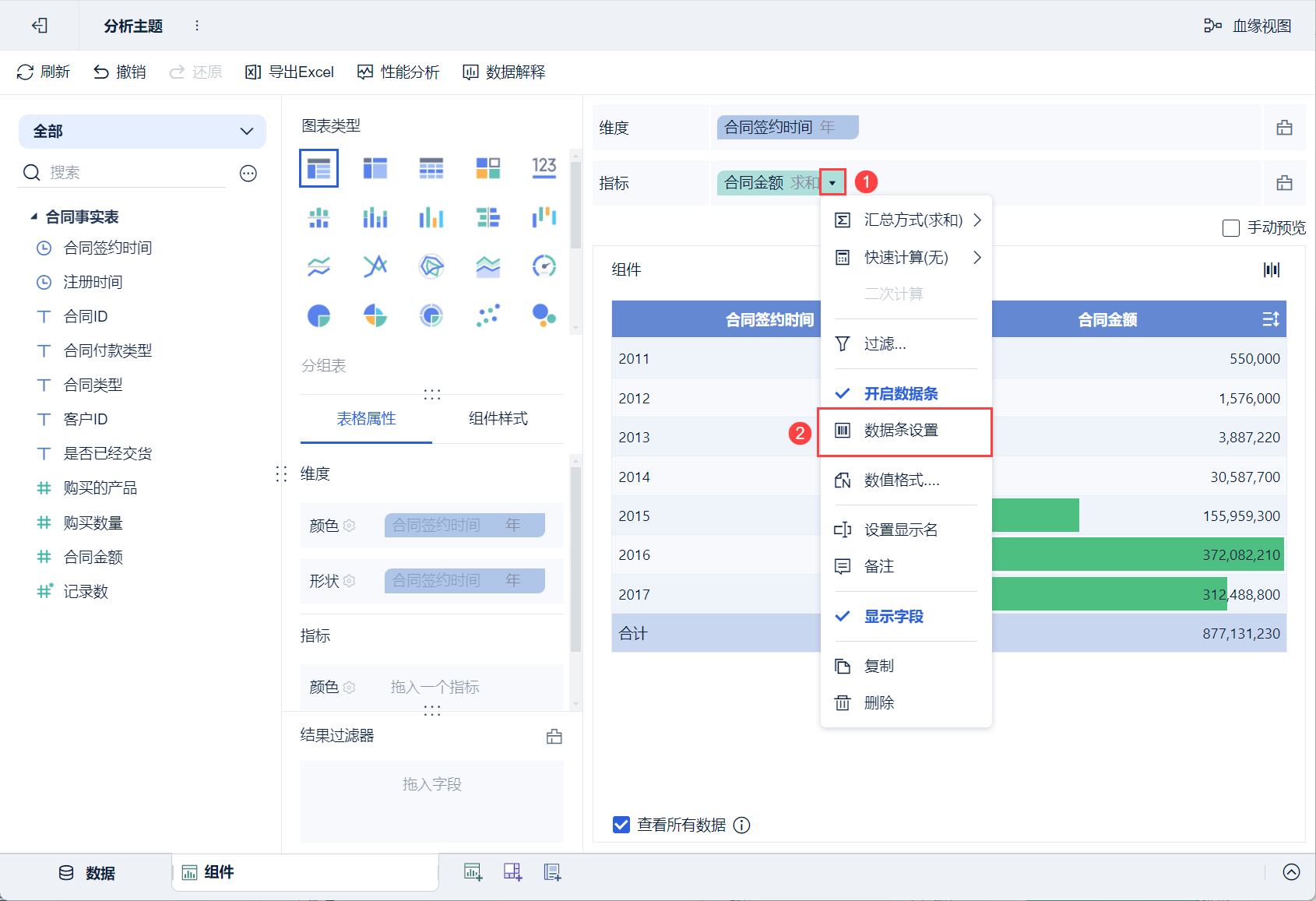 点击指标栏「合同金额」的下拉按钮,选择「开启数据条」,如下图所示: