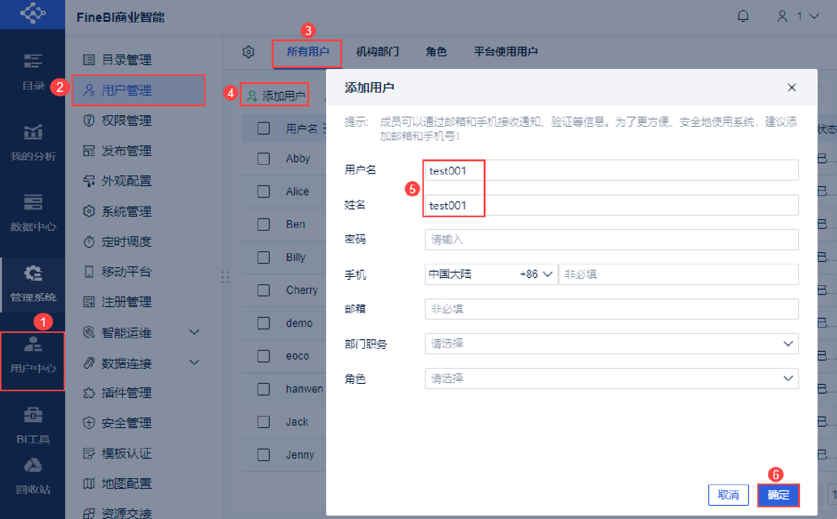 点击「管理系统>用户管理>添加用户」,添加用户「test001」,如下图所示: