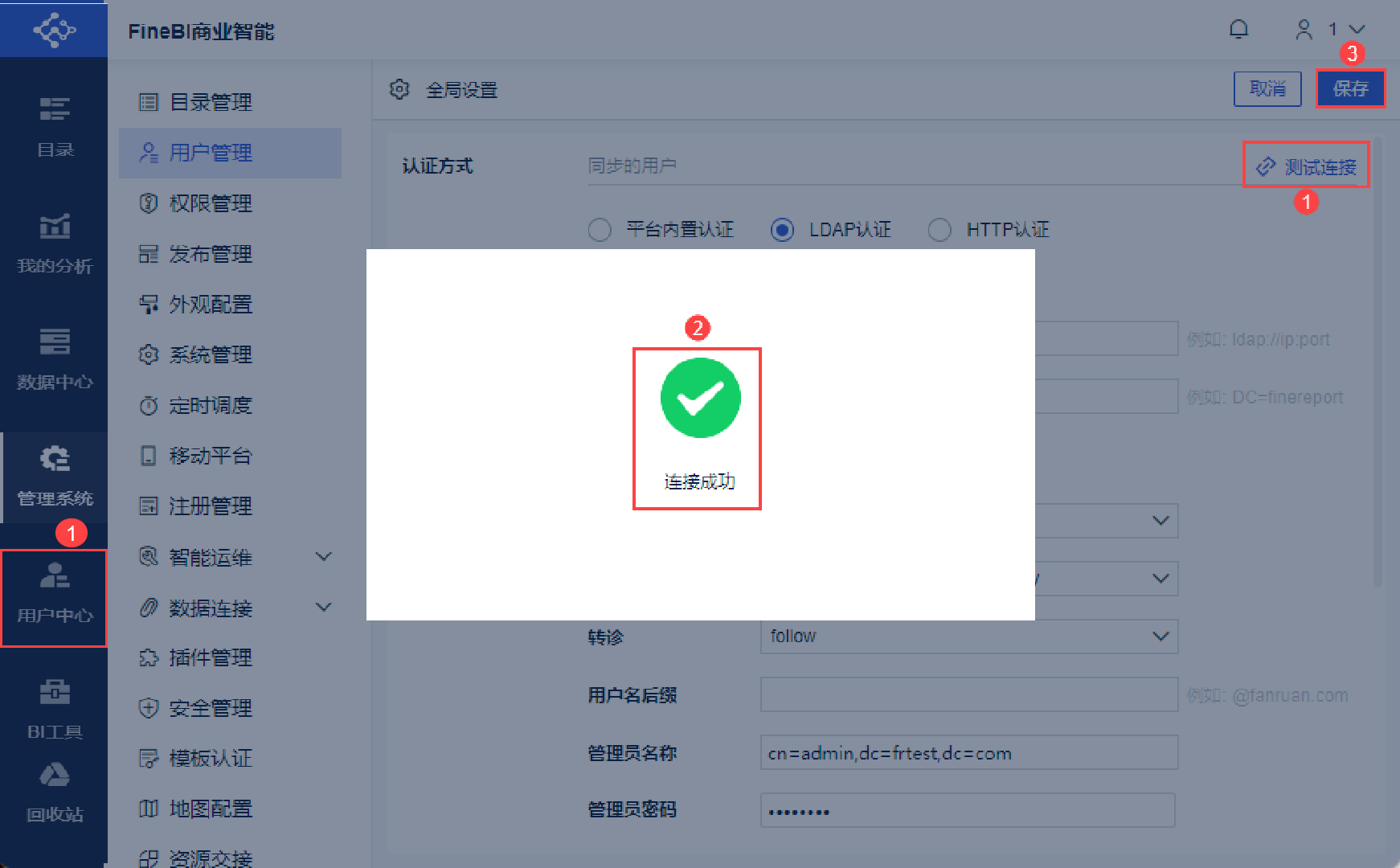 用户需要在数据决策系统中使用同样的认证方法,可在数据决策系统的「管理系统>用户管理>全局设置」处开启 LDAP 认证。