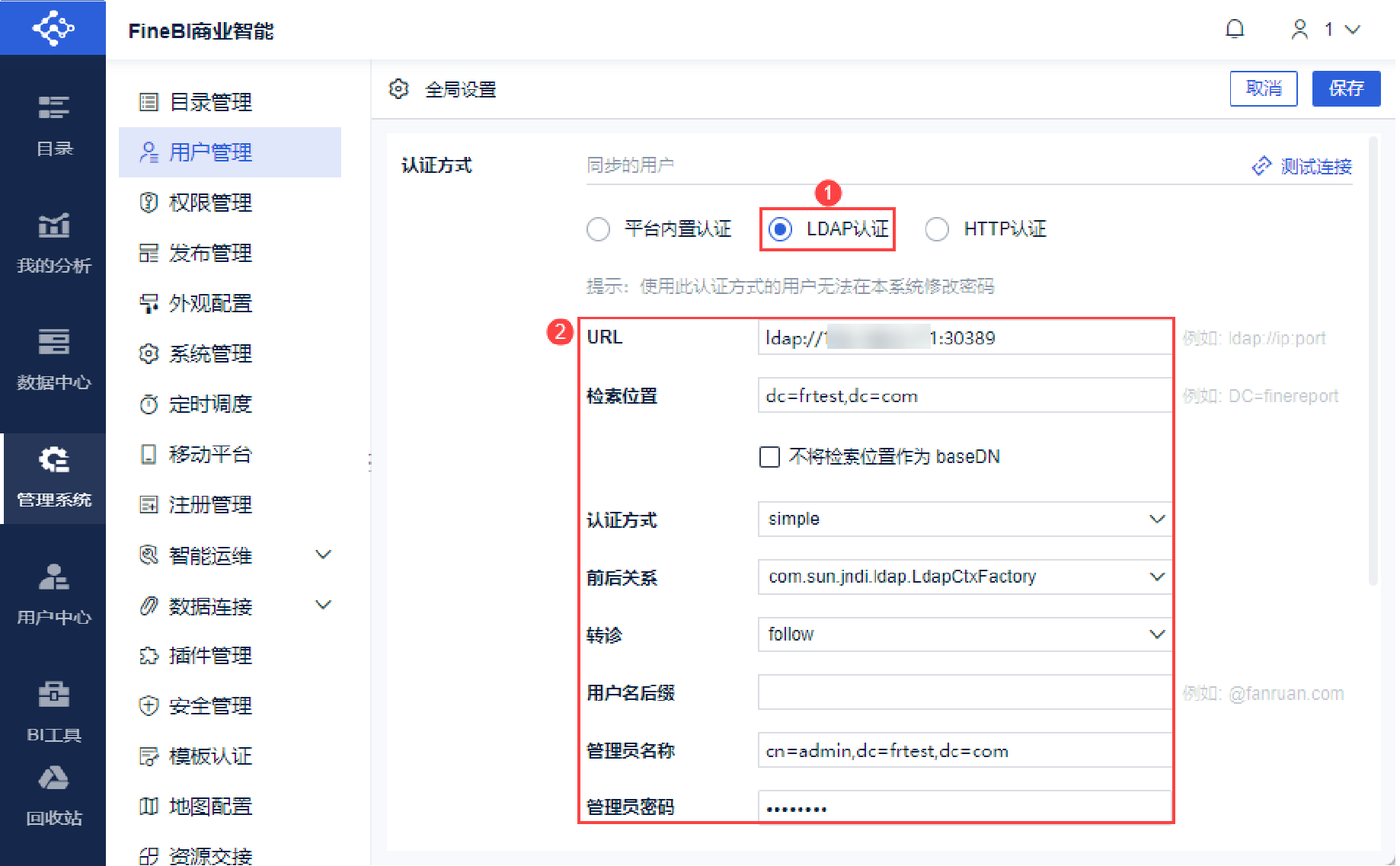 注3:通过安装「同步LDAP域用户」插件,支持把 LDAP 服务器中的用户直接同步到数据决策系统中,详情请参见:同步LDAP域用户