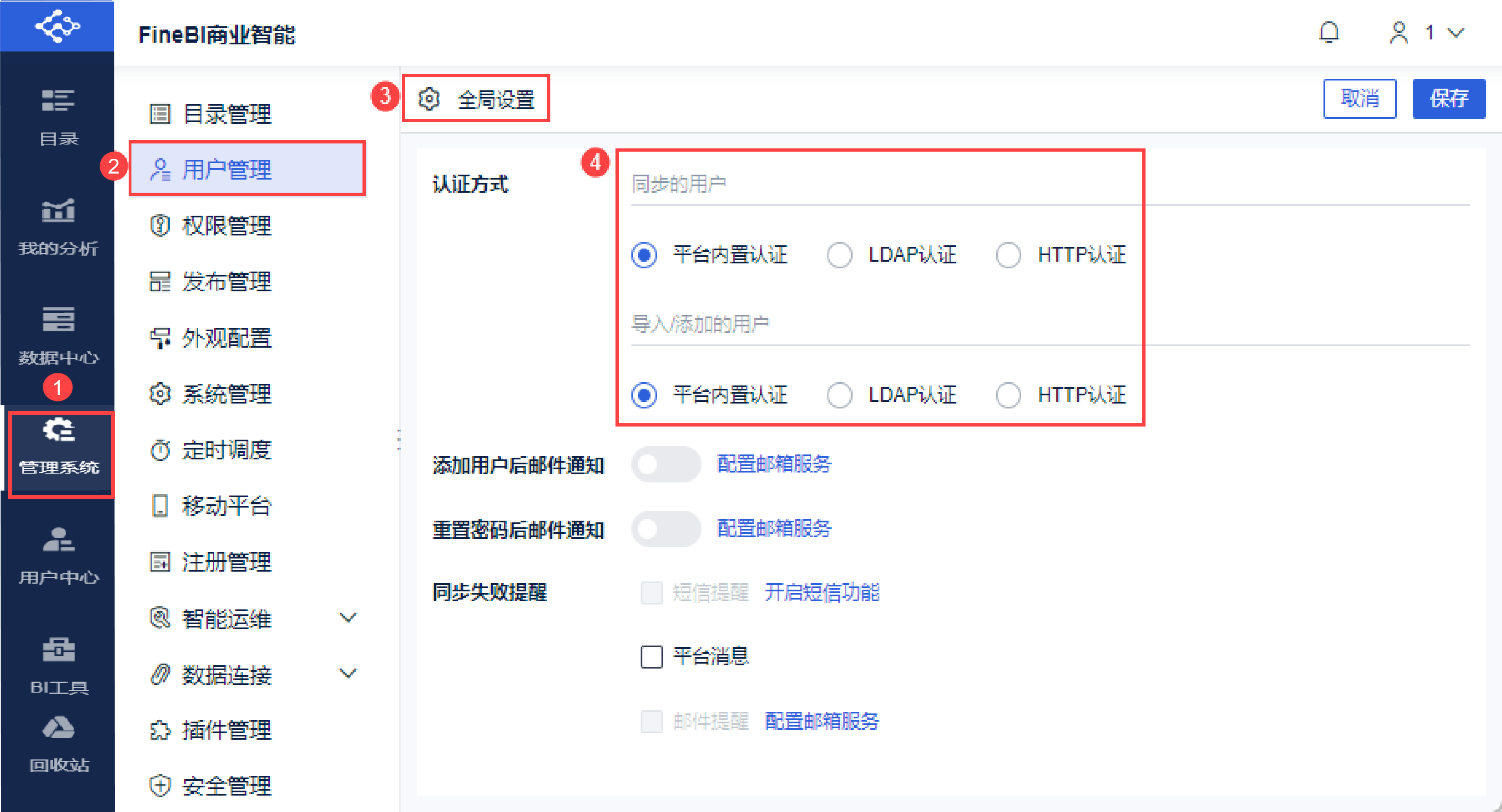 1)以管理员身份进入数据决策系统,点击「管理系统>用户管理>全局设置」,可分别为「同步用户」和「导入/添加的用户」选择认证方式。如下图所示: