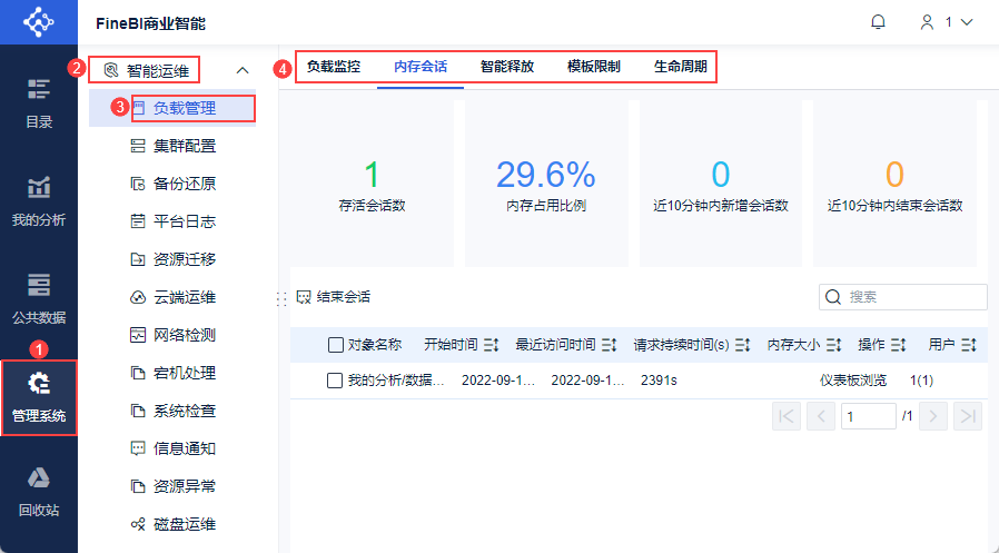 用户在FineBI系统,打开一张目录中的模板,即为一个会话。
