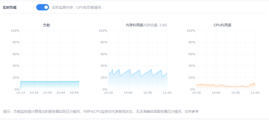 注1:负载监控是计算得出的服务器实际压力情况,内存与CPU监控仅代表客观状态,无法准确体现服务器压力情况,仅供参考。