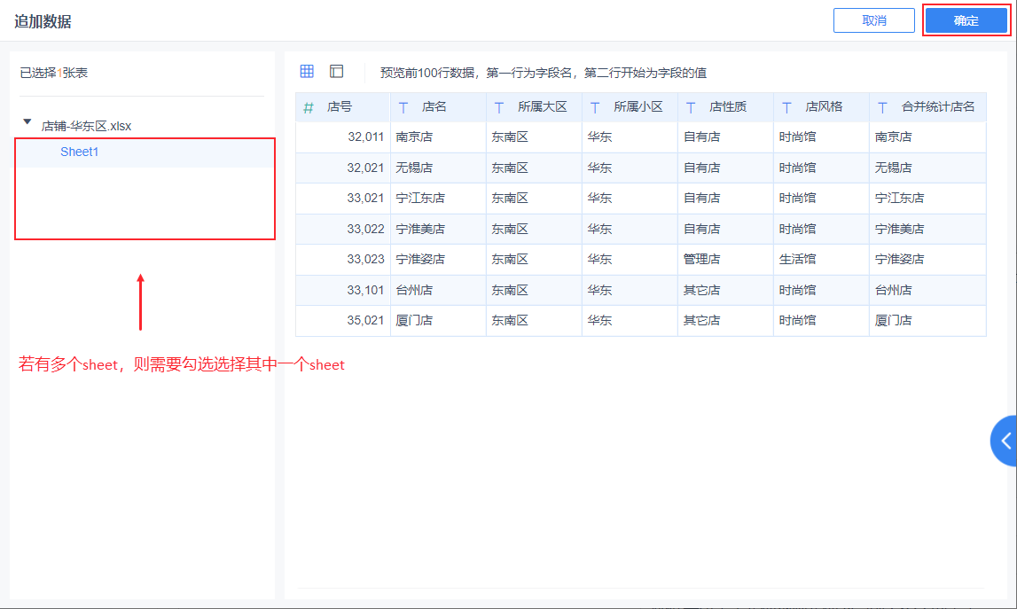 2)用户需要勾选自己需要的 sheet 页。若 Excel 文件就只有一个 sheet ,直接上传就可以。点击「确定」,如下图所示: