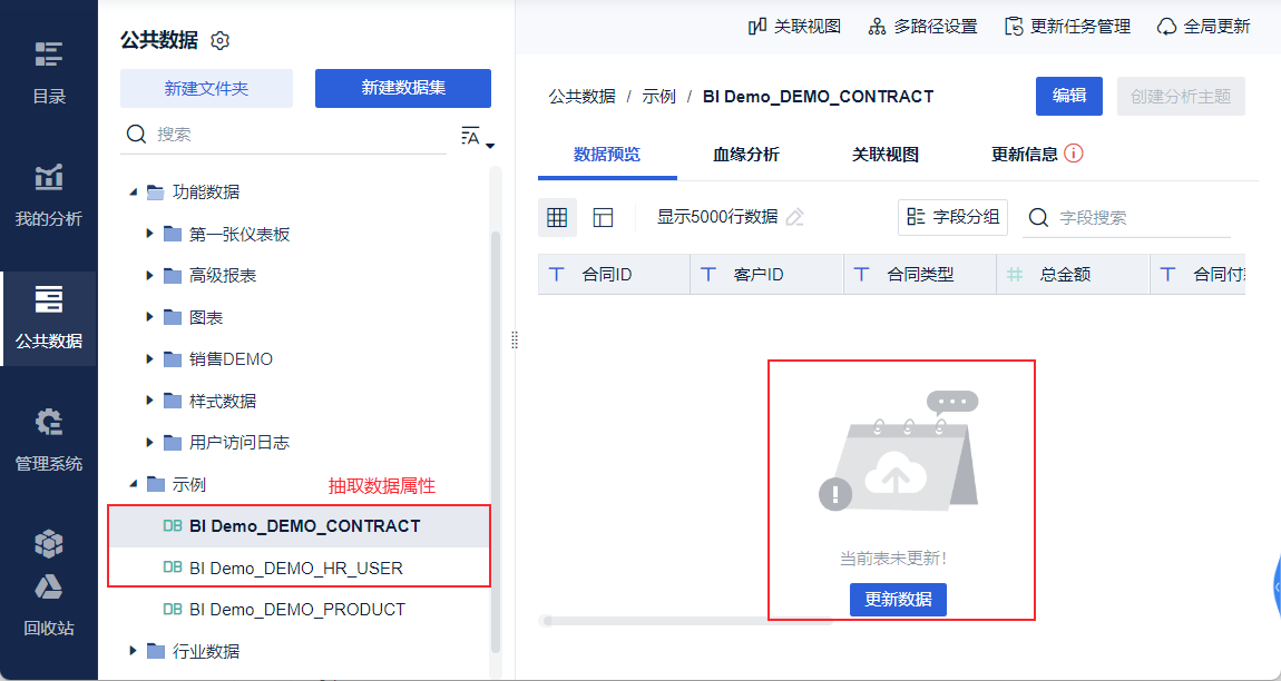 3)直连数据属性的表添加后直接可以使用,抽取数据属性的表需要进行更新,如下图所示: