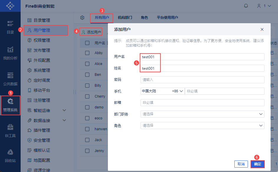 点击「管理系统>用户管理>添加用户」,添加用户「test001」,如下图所示: