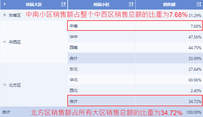 需要求每个分组下的指标占比,并且能够求分组下的每个节点的指标占比。例如,希望展示每个「所属大区」的销售额占比,同时展开每个大区的节点,可以看到每个大区里「所属小区」销售额占「当前大区」销售额比重,如下图所示: