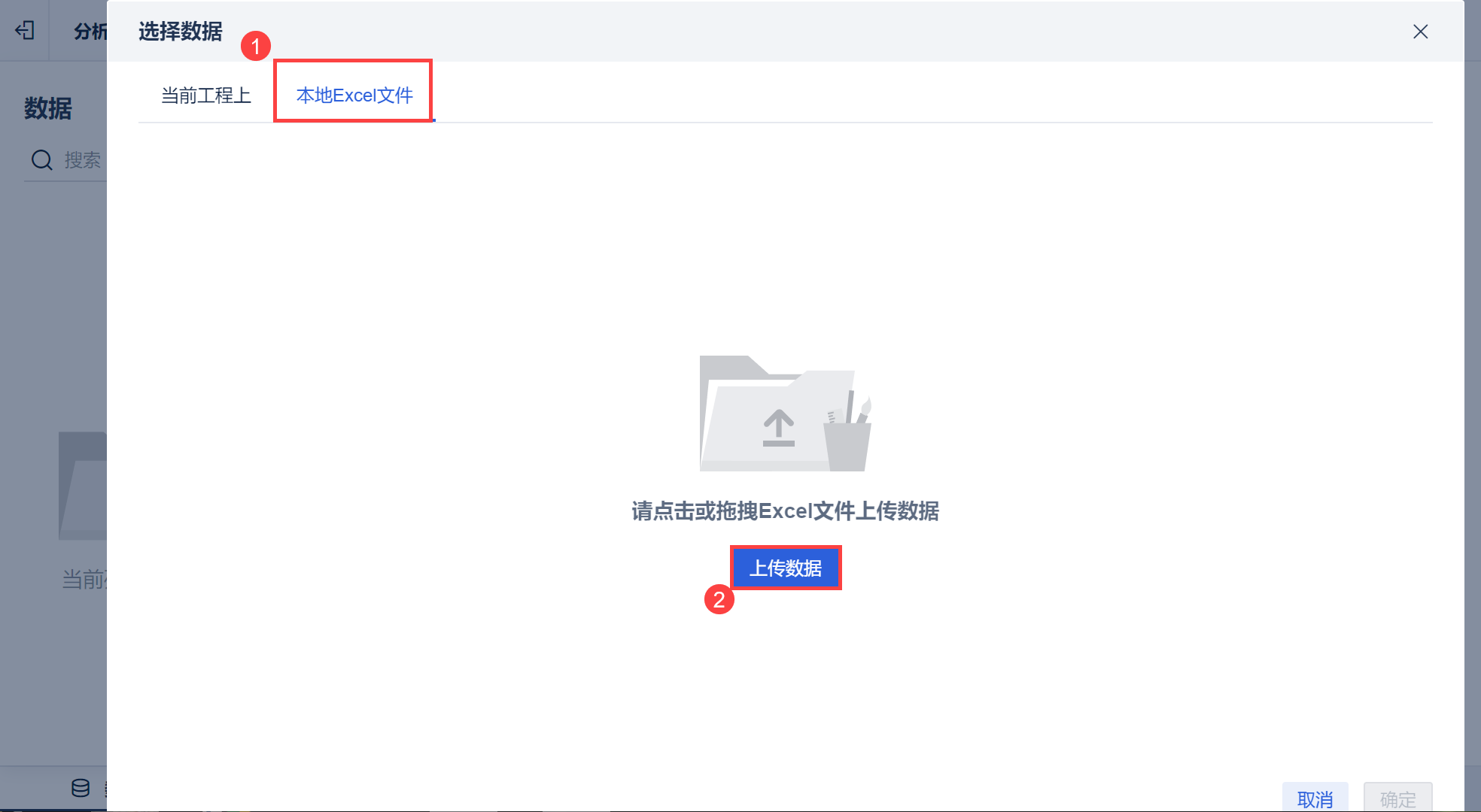 新建「分析主题」,点击「本地Excel文件>上传数据」,上传示例数据,如下图所示: