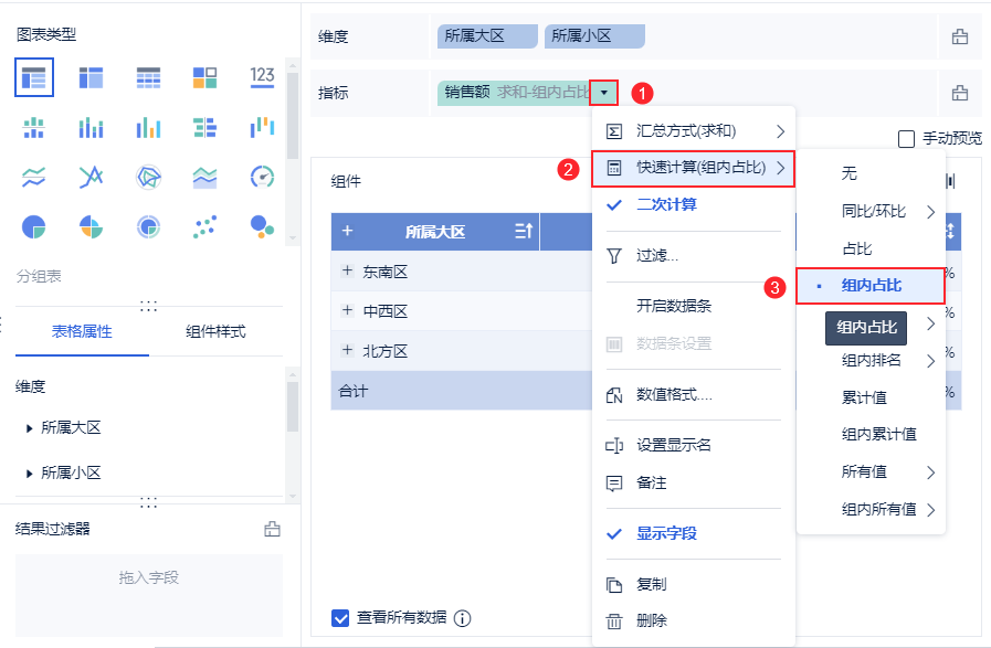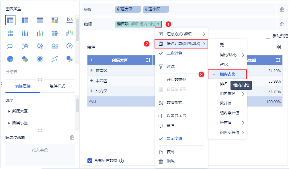 」下拉按钮进行「快速计算>组内占比」,来获取组内占比的指标数据。实现方式更快捷。如下图所示: