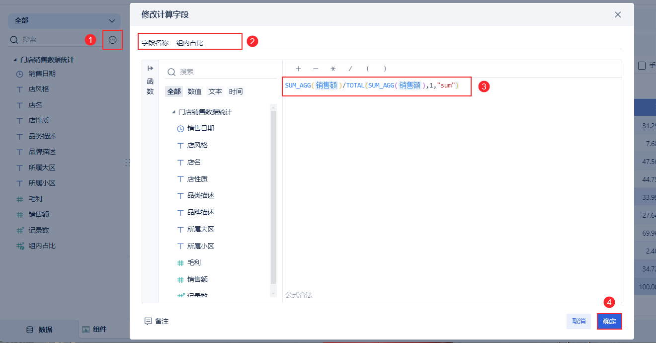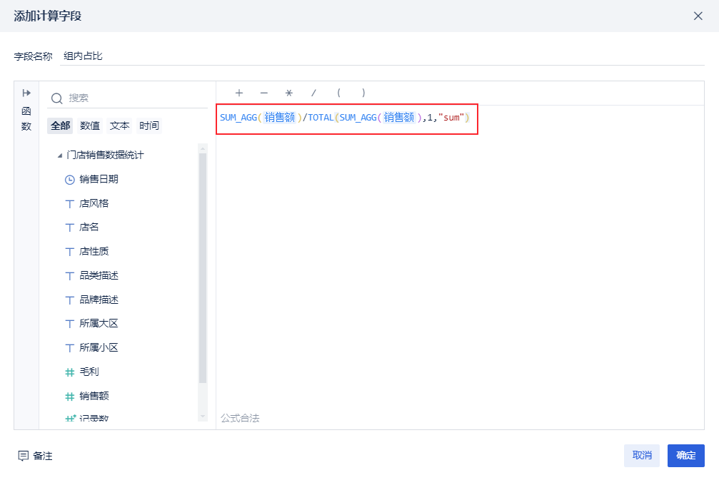 在组件中新建计算字段「组内占比」,输入公式:SUM_AGG(销售额)/TOTAL(SUM_AGG(销售额),1,"sum"),用分组汇总的销售额比上总销售额得出占比,如下图所示: