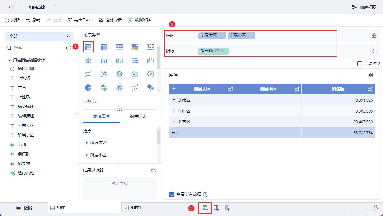 1)点击下方添加组件,创建分组表,将「所属大区」、「所属小区」以及「销售额」拖入维度指标栏,如下图所示:
