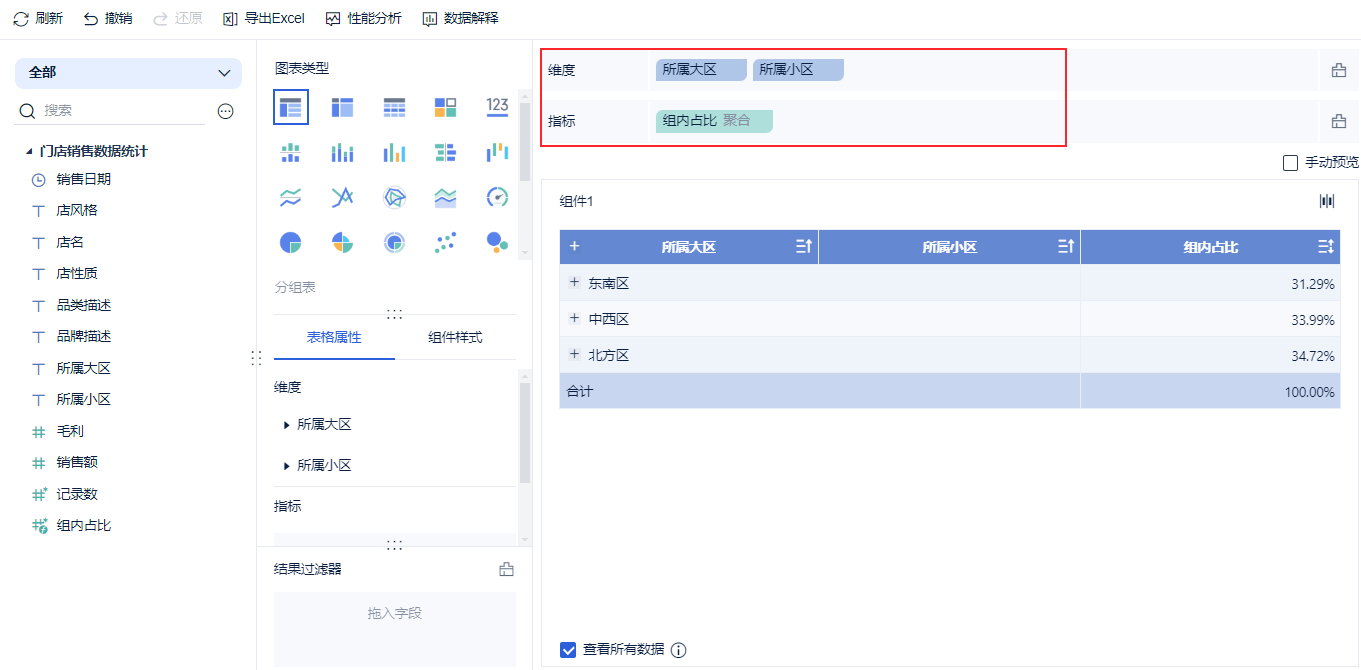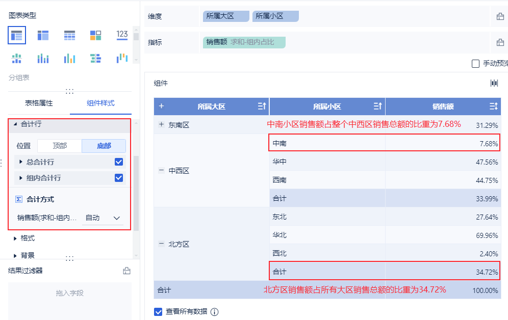 需要求每个分组下的指标占比,并且能够求分组下的每个节点的指标占比。例如,希望展示每个「所属大区」的销售额占比,同时展开每个大区的节点,可以看到每个大区里「所属小区」销售额占「当前大区」销售额比重,如下图所示: