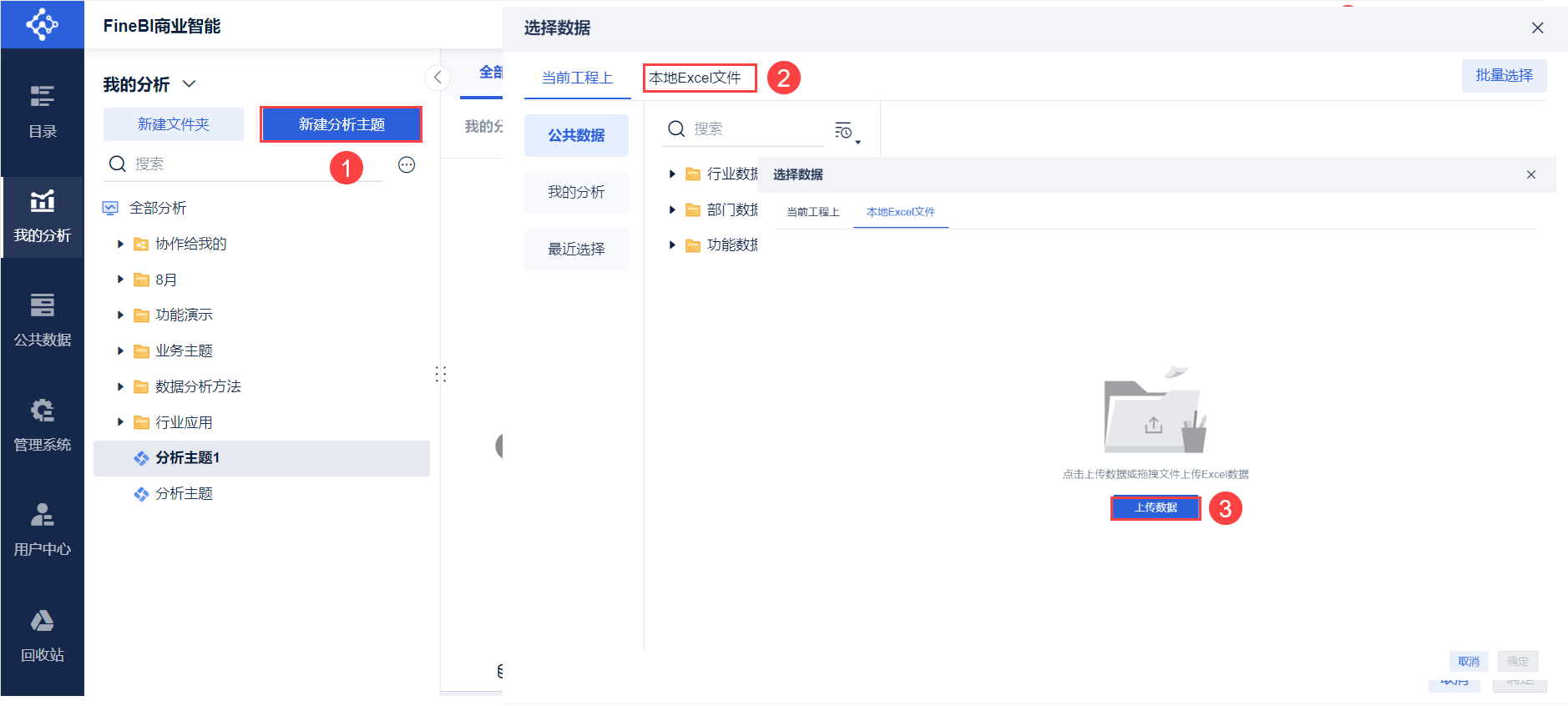 新建「分析主题」,点击「本地Excel文件>上传数据」,上传示例数据,如下图所示: