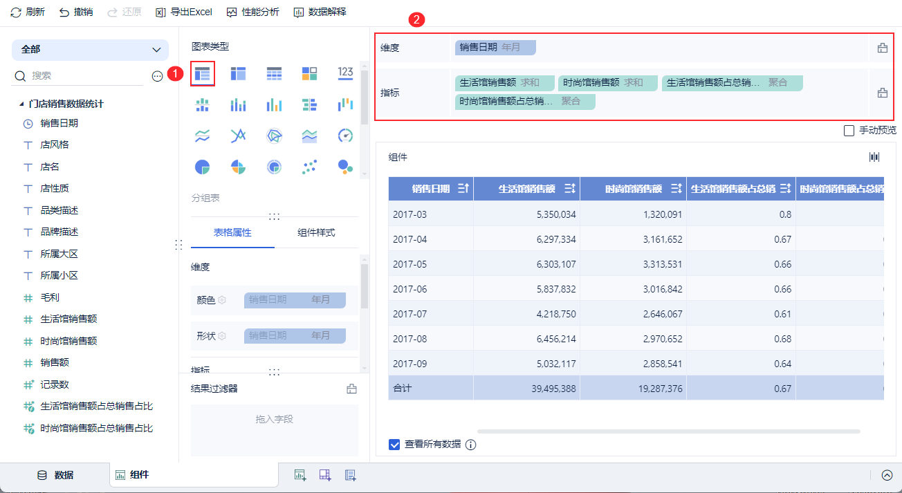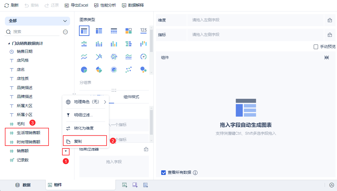 1)进入组件编辑界面,复制待分析区域的「销售额」字段,并为复制的指标分别命名为「生活馆销售额」和「时尚馆销售额」,如下图所示: