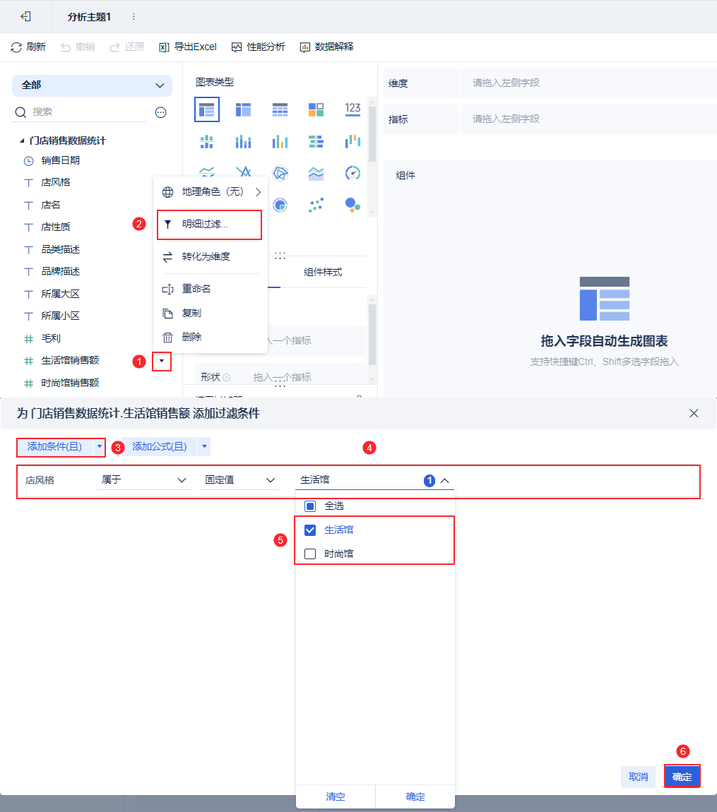 3)对「生活馆销售额」进行「明细过滤」,设置过滤条件为「店风格属于生活馆」,点击「确定」,如下图所示: