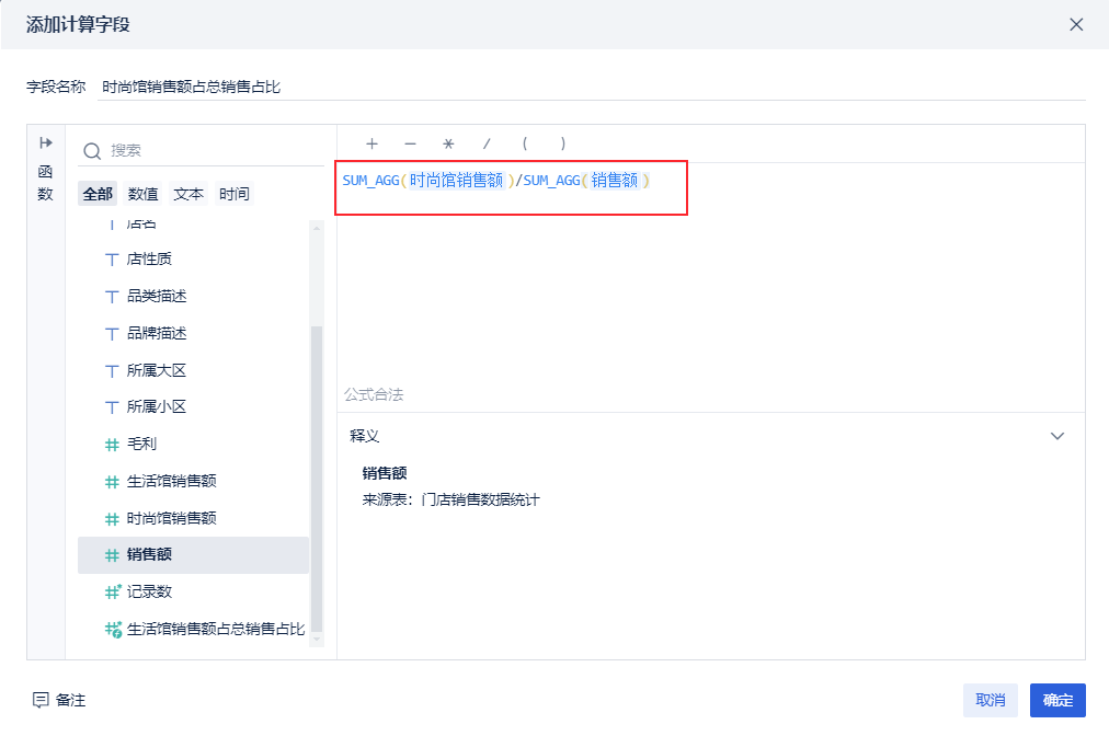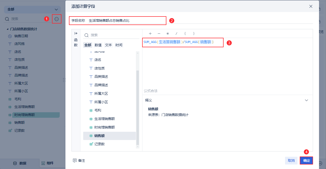 1)添加计算字段,命名为「生活馆销售额占总销售占比」,输入公式:SUM_AGG(生活馆销售额)/SUM_AGG(销售额),点击「确定」,如下图所示: