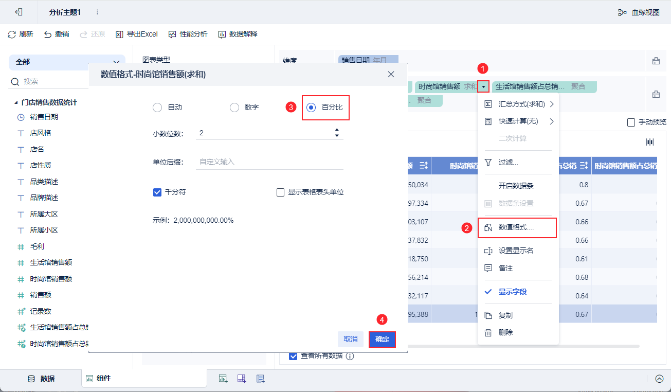 4)将「生活馆占总销售额占比」的数值格式改为百分比,「时尚馆销售额占总销售额占比」同理,如下图所示: