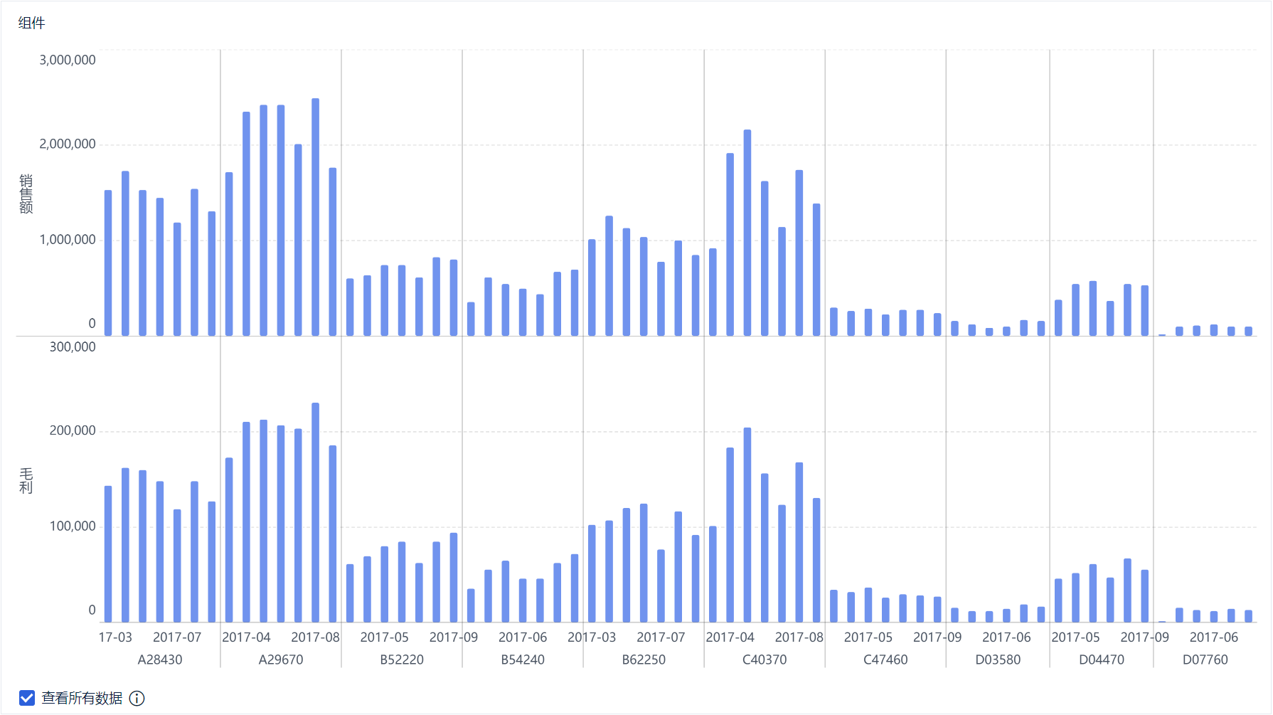 例如,用分区柱形图展示不同品牌2017年3-9月的销售额和毛利额,如下图所示: