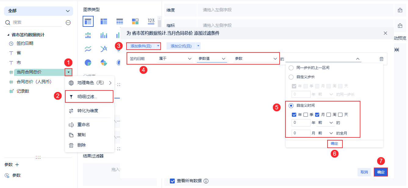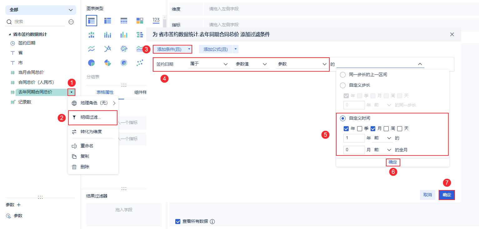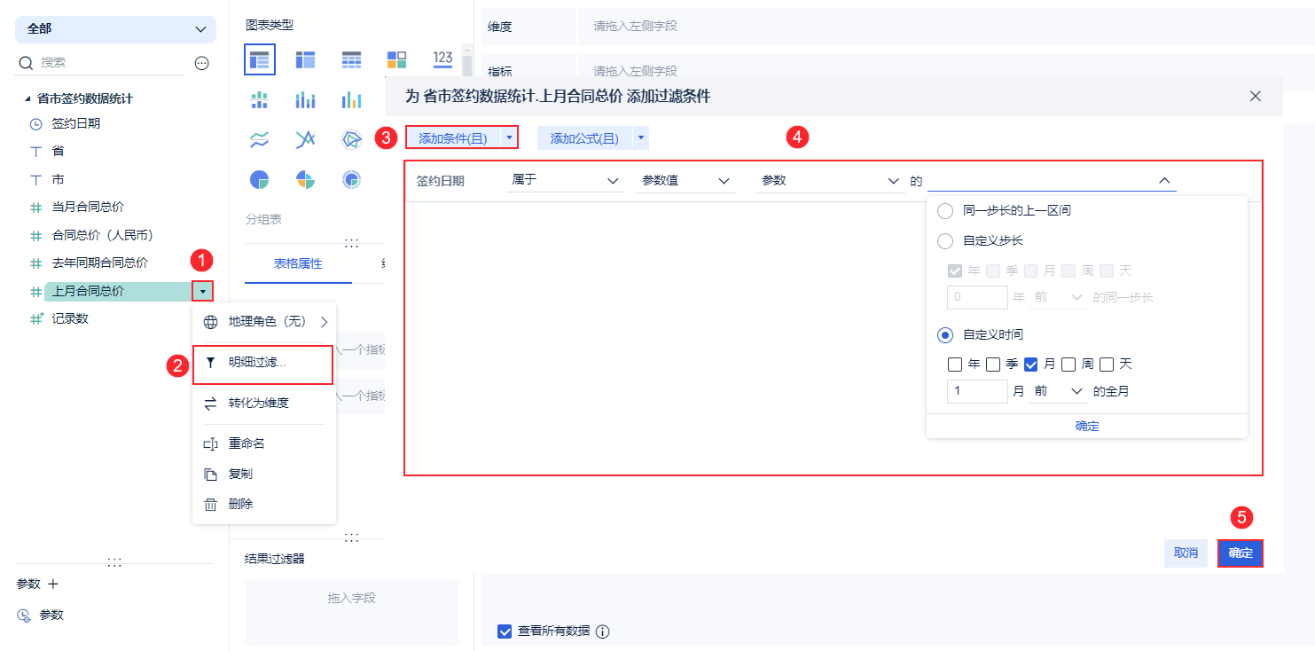 2)对「去年同期合同总价」字段进行明细过滤。过滤实现的效果为:对合同总价进行筛选,得到日期过滤组件所选日期一年前全月的数据