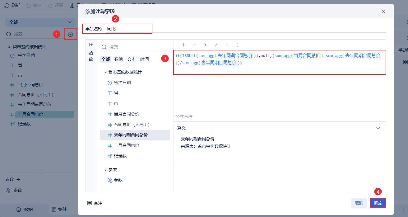 添加同比计算字段,输入公式:if(ISNULL(sum_agg(去年同期合同总价)),null,(sum_agg(当月合同总价)-sum_agg(去年同期合同总价))/sum_agg(去年同期合同总价))