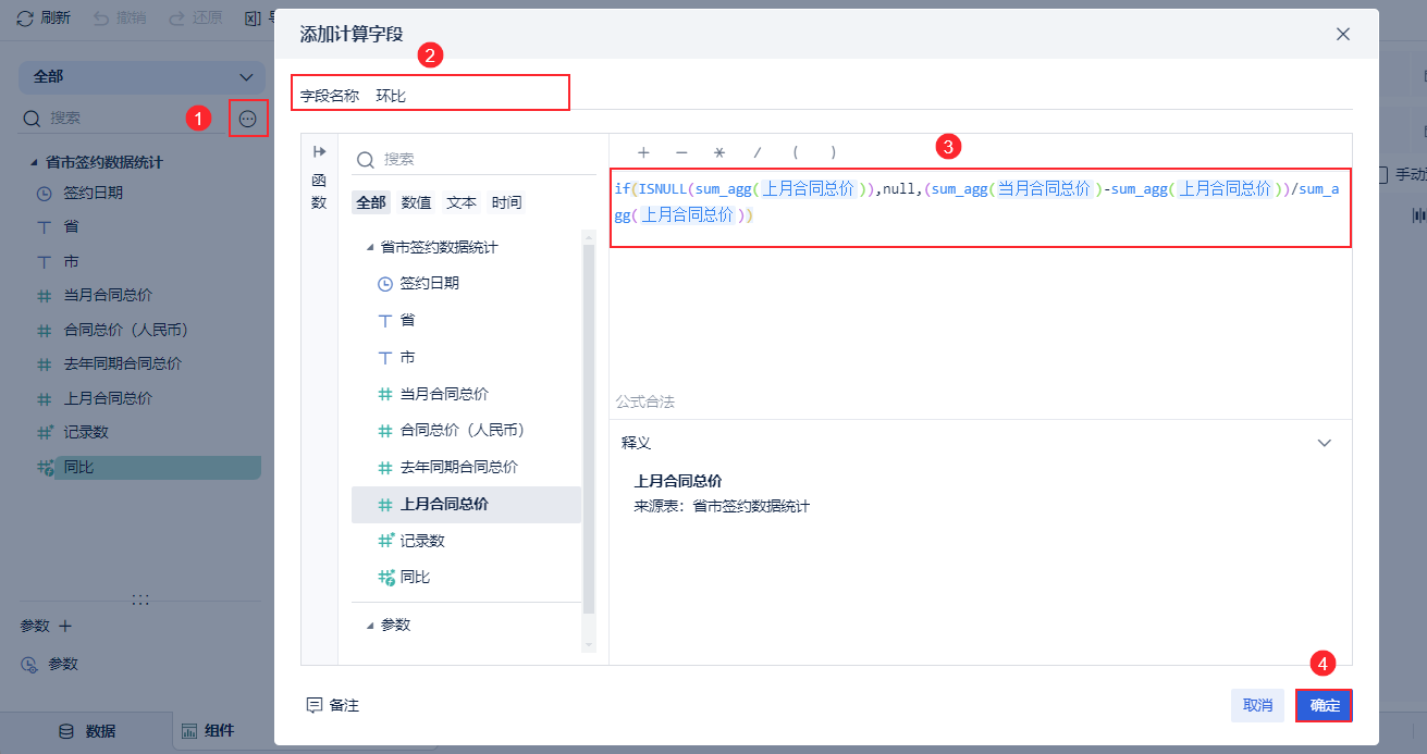 添加环比计算字段。,输入公式:if(ISNULL(sum_agg(上月合同总价)),null,(sum_agg(当月合同总价)-sum_agg(上月合同总价))/sum_agg(上月合同总价))