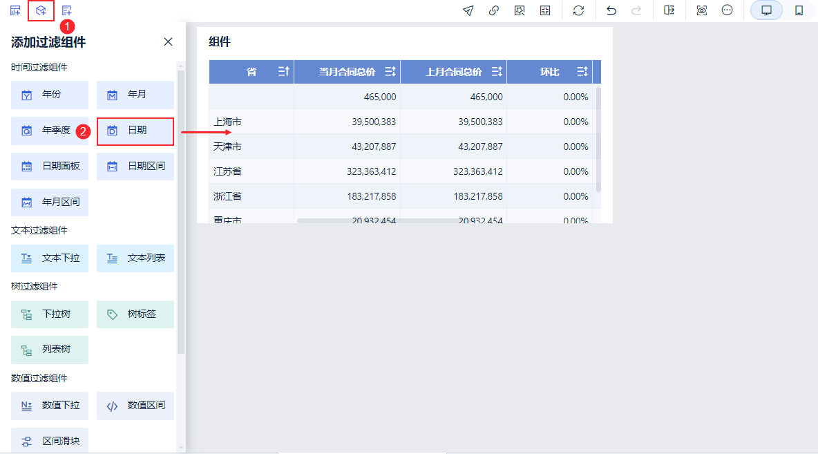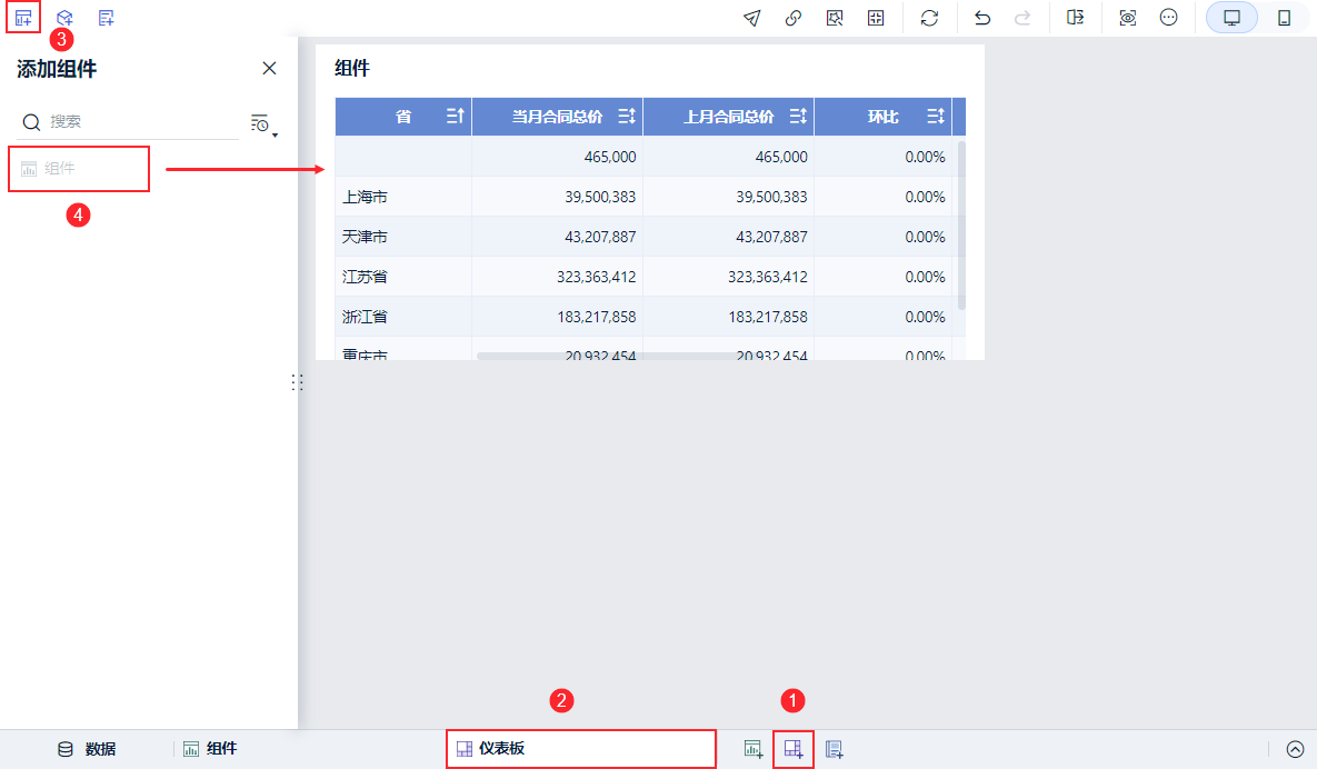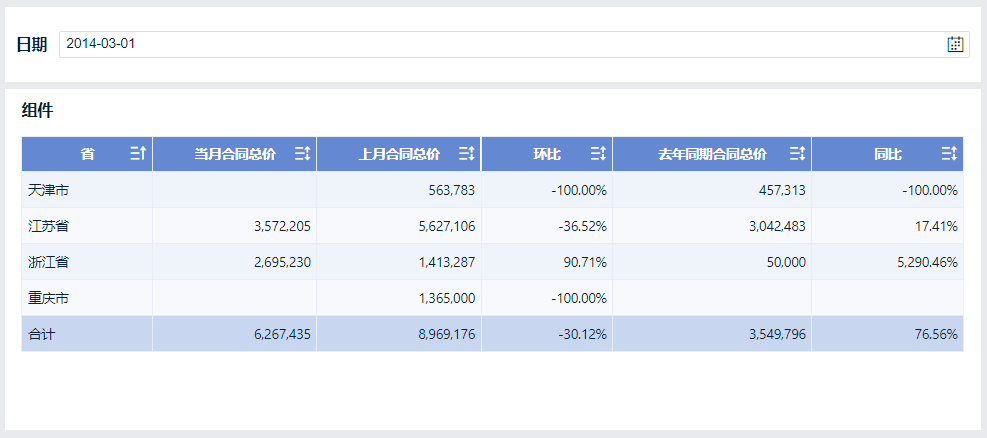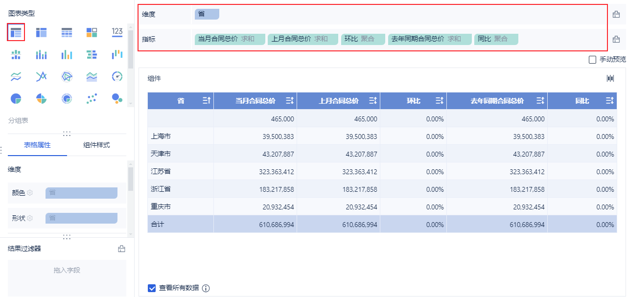 注:此处由于没有选择日期,因此同一省份当月、上月、去年同期的合同总价都相等,所以同比环比均为0,当日期过滤组件选择日期后即显示对应时间的同环比。