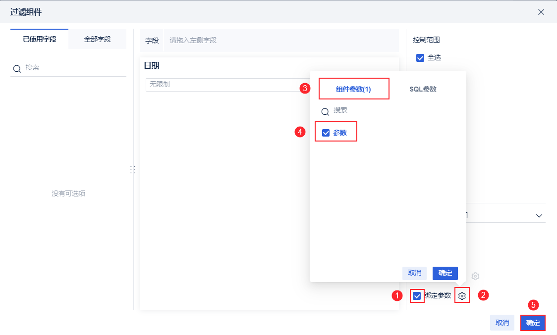 3)对过滤组件绑定参数,实现过滤组件筛选的日期即为我们新建的参数的动态日期,如下图所示: