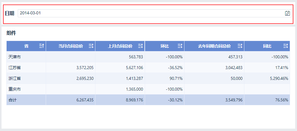 例如在日期过滤组件中输入「2014-03-01」,组件中自动筛选出各个省份 2014 年 3 月的合同金额,并计算出 3 月合同金额的同比环比。如下图所示: