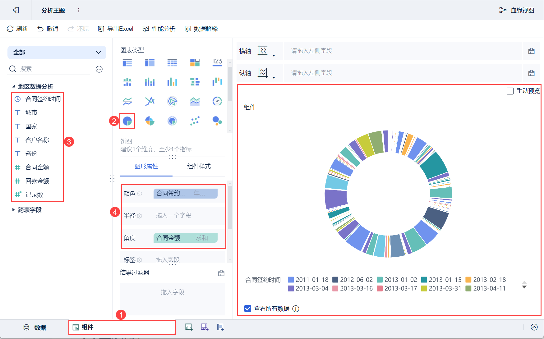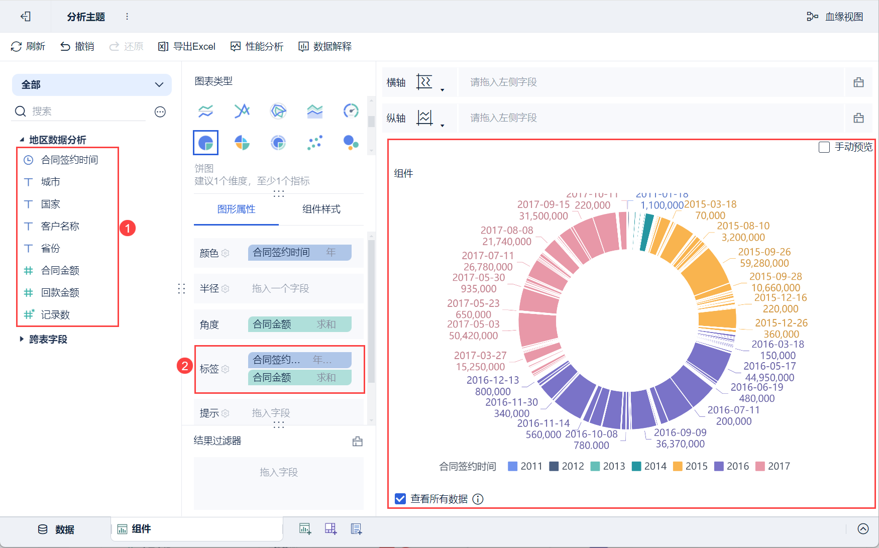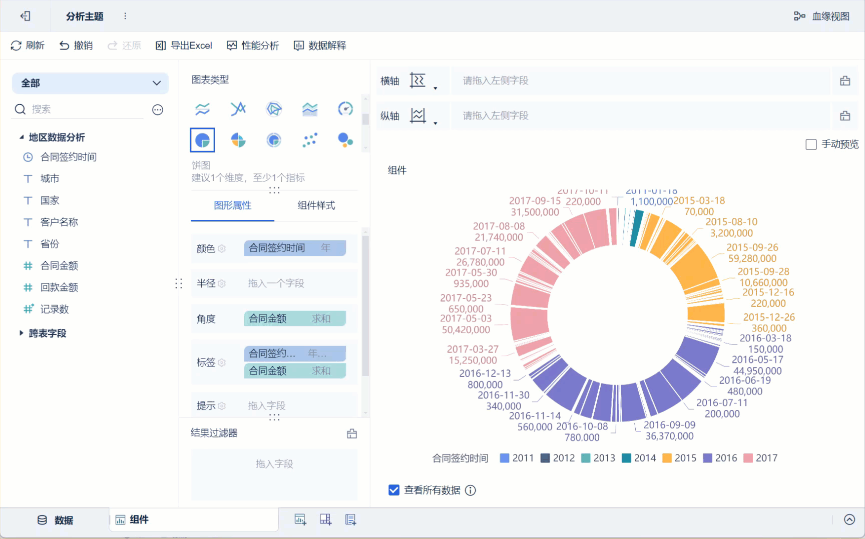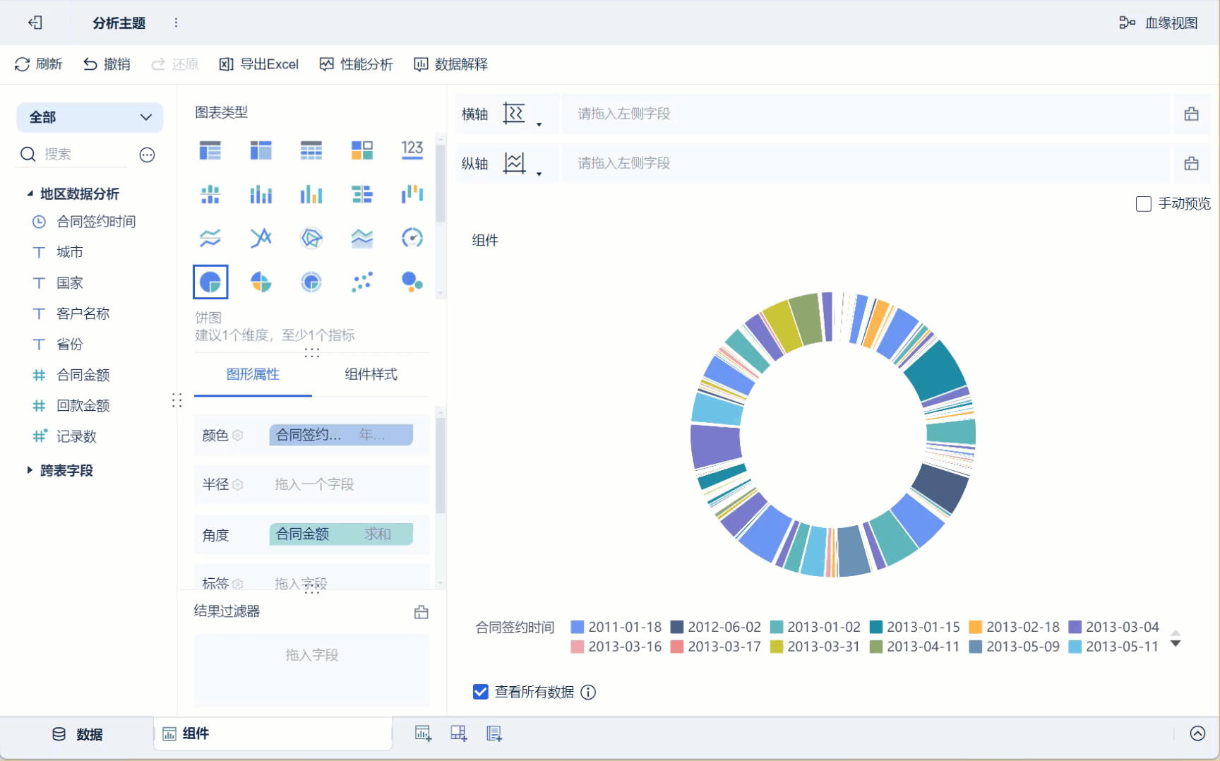 3)将左侧待分析区域的维度字段「合同签约时间」、指标字段「合同金额」分别拖入「图形属性」下的颜色栏和角度,则生成一个不同签约时间显示为不同颜色,合同金额大小对应角度大小的饼图,如下图所示:
