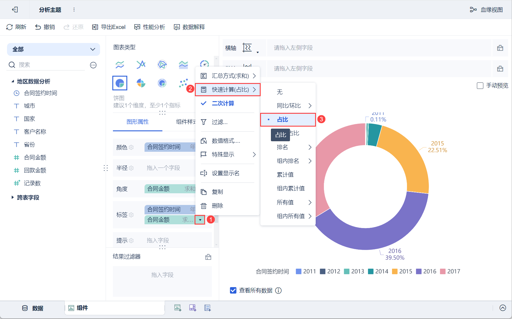 点击标签栏中「合同金额」的下拉按钮,选择「快速计算>占比」,则饼图则显示合同金额的占比标签,如下图所示: