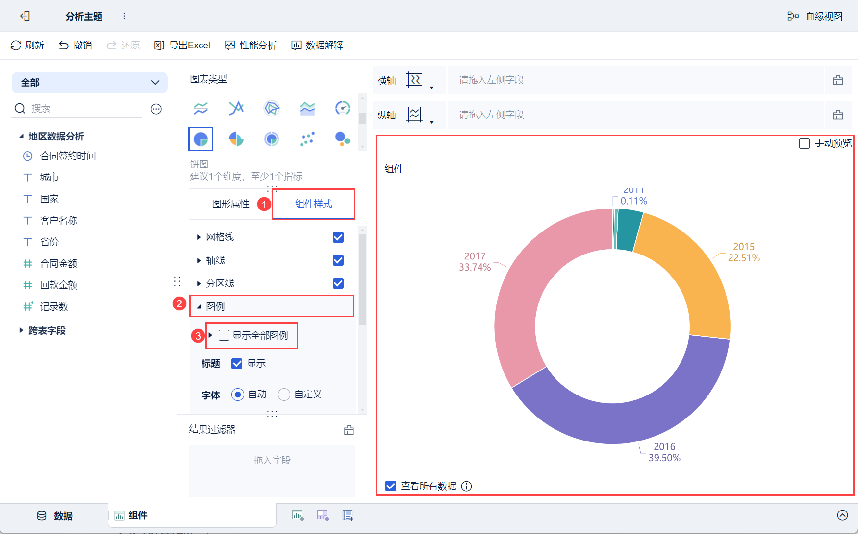 点击「组件样式>图例」,取消勾选「显示全部图例」,图例则不显示,如下图所示: