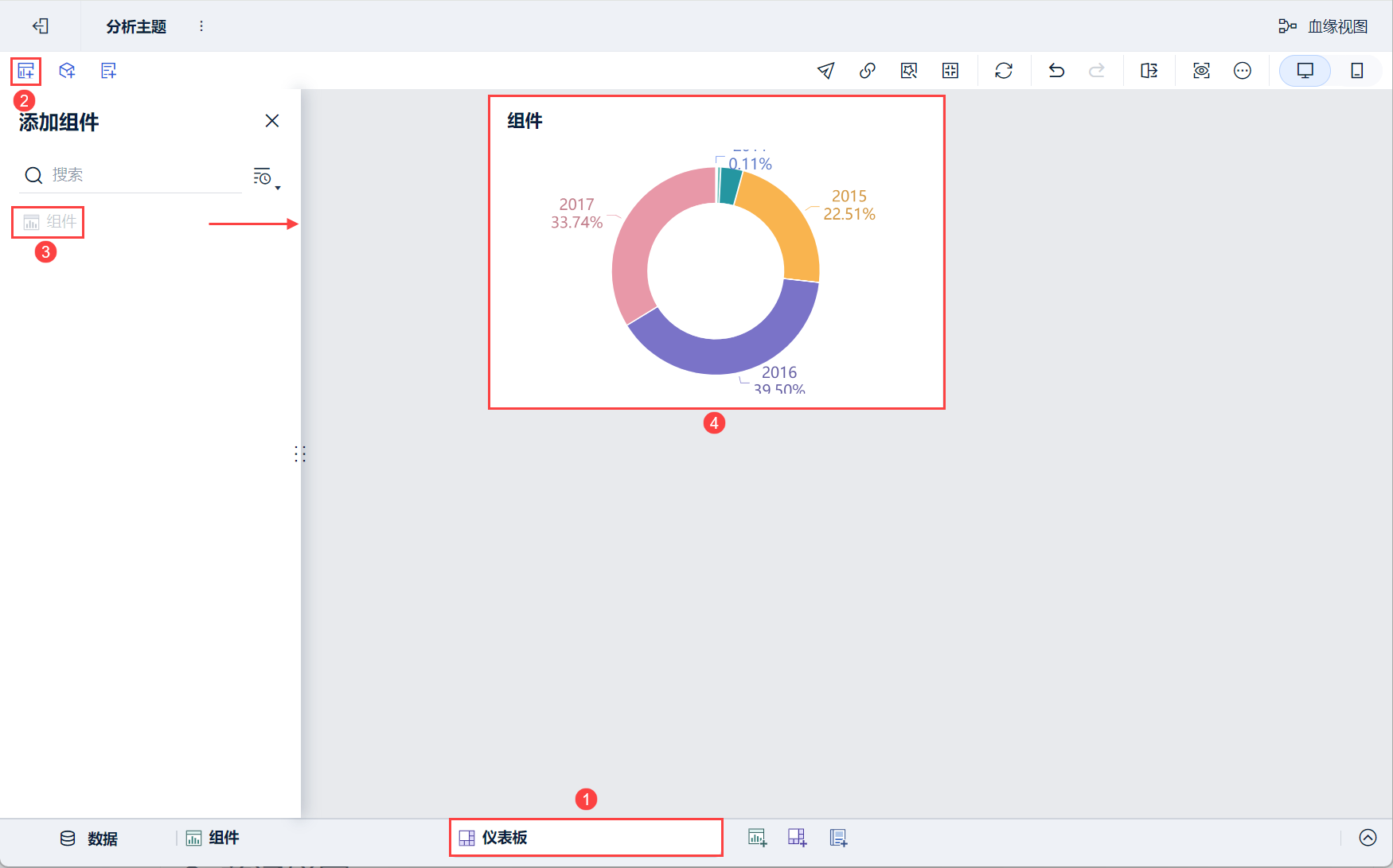 1)点击分析主题编辑界面下方添加仪表板。