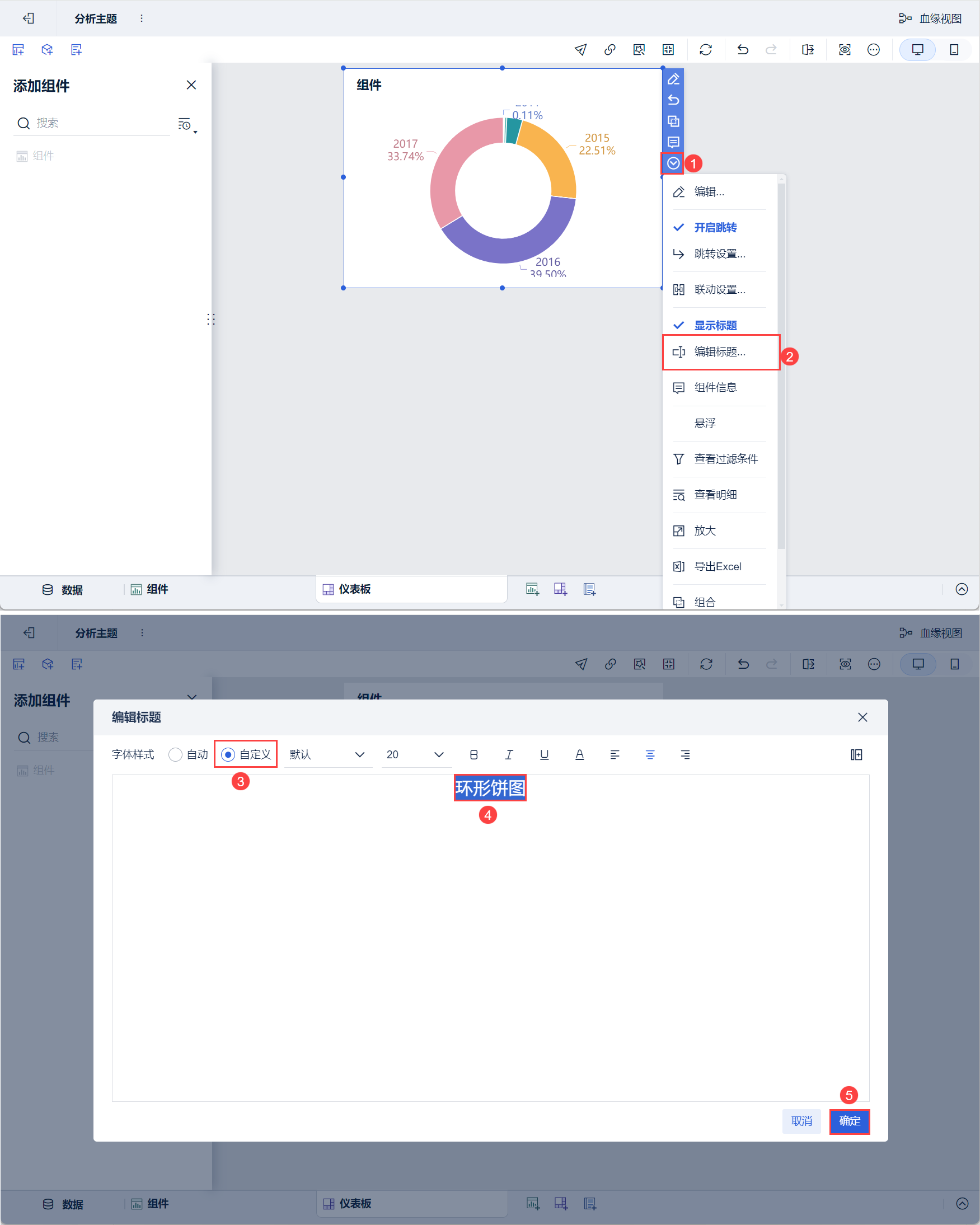 3)下拉选择「编辑标题」,样式选择「自定义」,设置标题为「环形饼图」,点击「确定」。如下图所示: