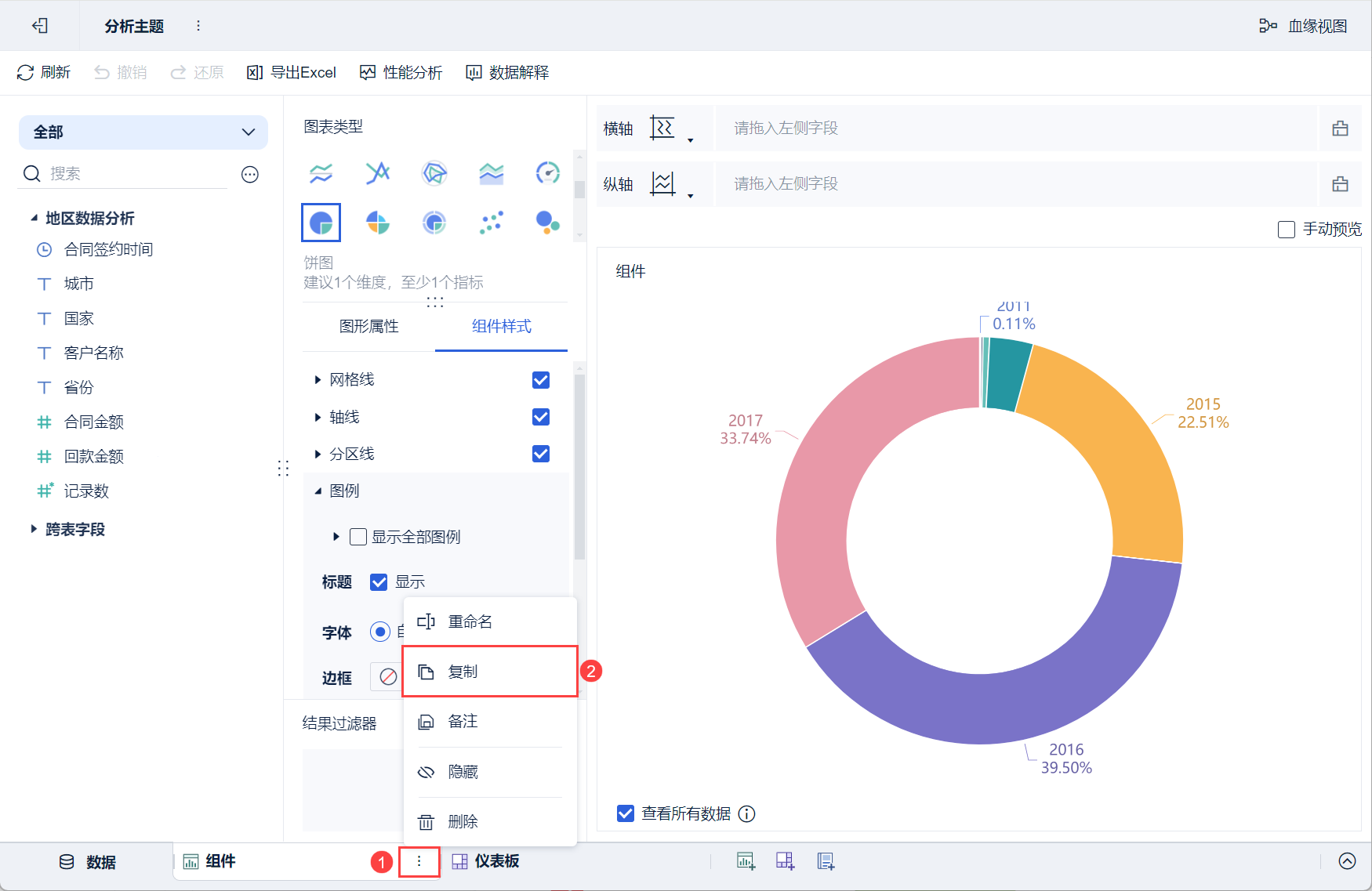 4)点击颜色栏「合同签约时间」的下拉按钮,选择其为「年」分组,饼图的不同颜色分组便按照合同签约时间的年份显示,如下图所示: