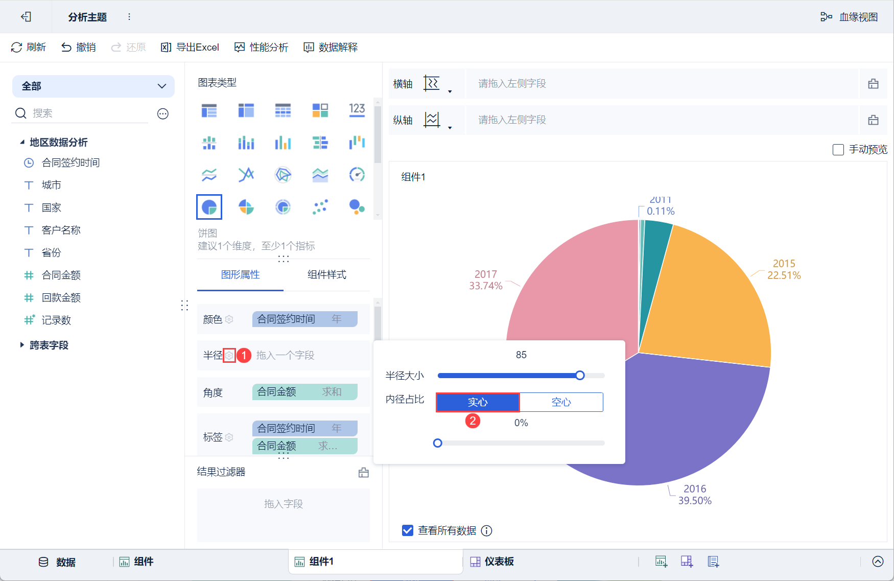 在「组件1」的组件编辑界面,点击「图形属性」下的半径设置按钮,在弹出的设置框中内径占比选择「实心」,环形饼图则变为普通饼图,如下图所示: