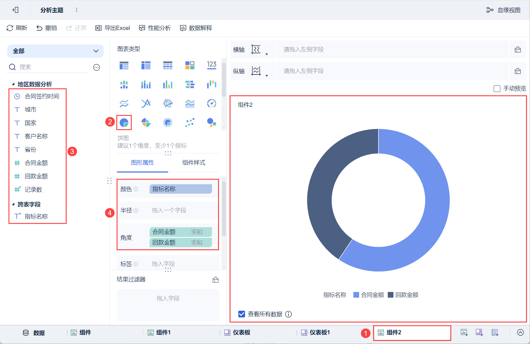 同2.4,只是将组件的名称修改为「多指标饼图」略有不同,此处不再赘述。