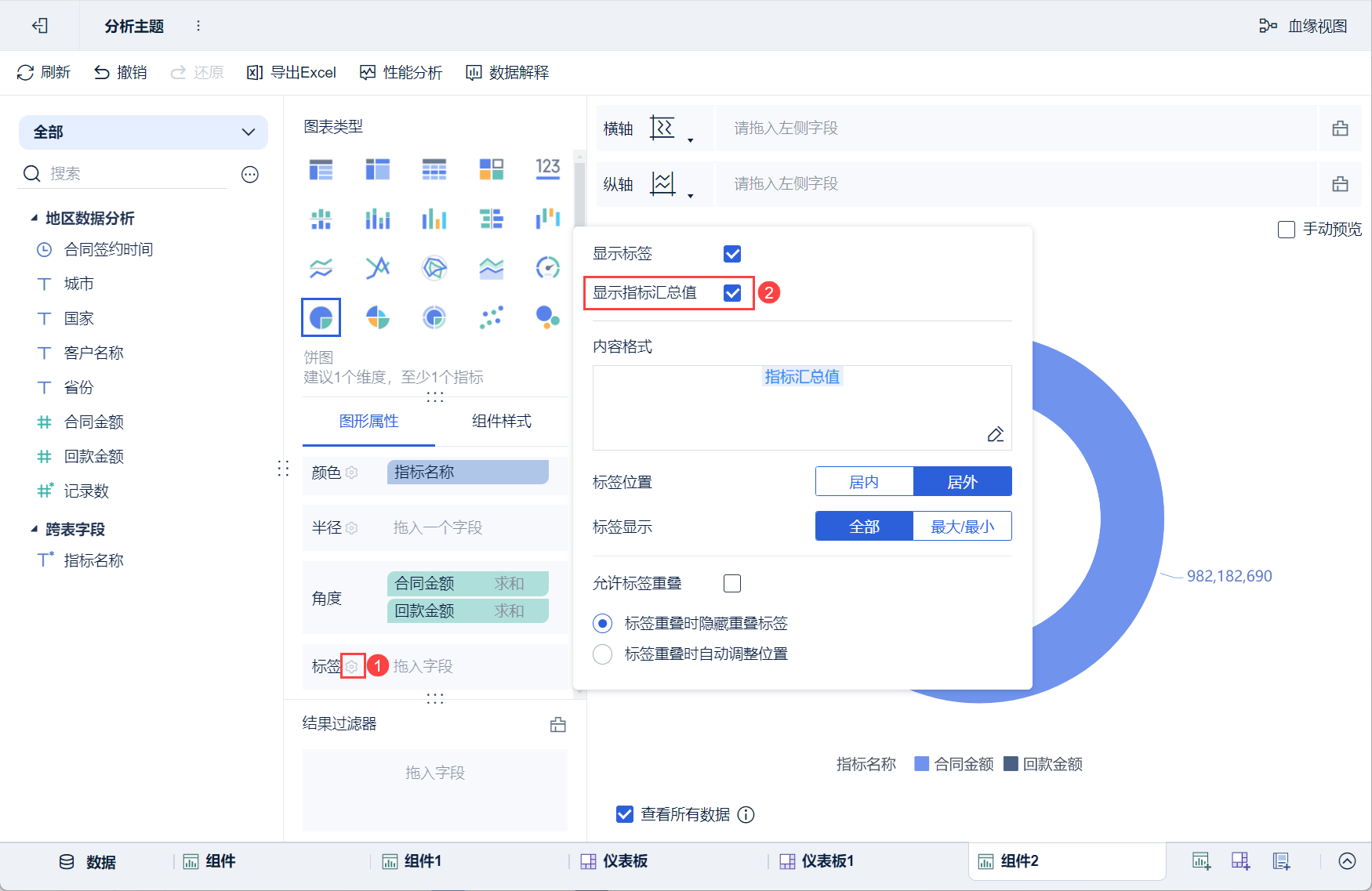 点击「图形属性」下的标签设置按钮,在弹出的设置框中勾选「显示指标汇总值」,饼图将会显示指标汇总值的标签,如下图所示:
