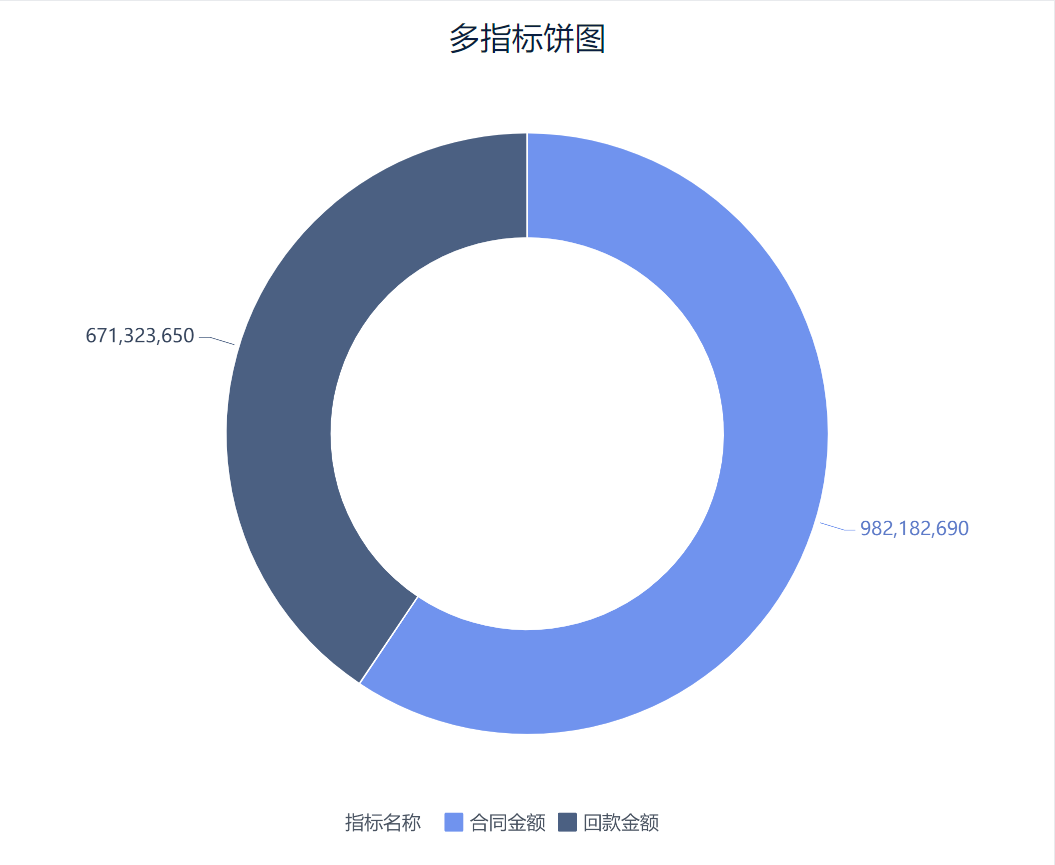 2)在图表类型下选择「饼图」,将左侧待分析区域的「指标名称」、「合同金额」和「回款金额」分别拖入「图形属性」下的颜色栏和角度栏,则生成一个不同指标显示为不同颜色,指标大小对应角度大小的饼图,如下图所示:
