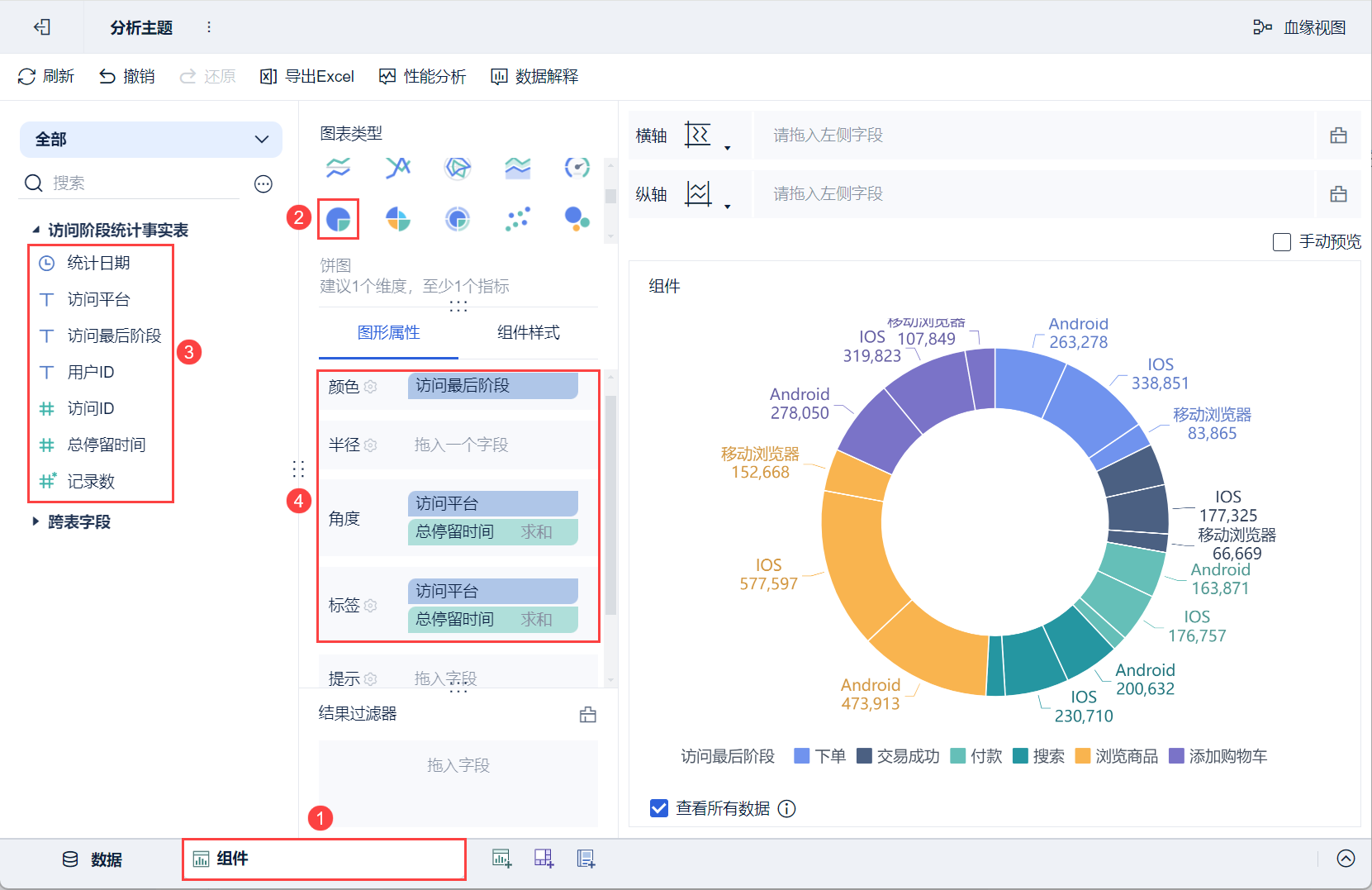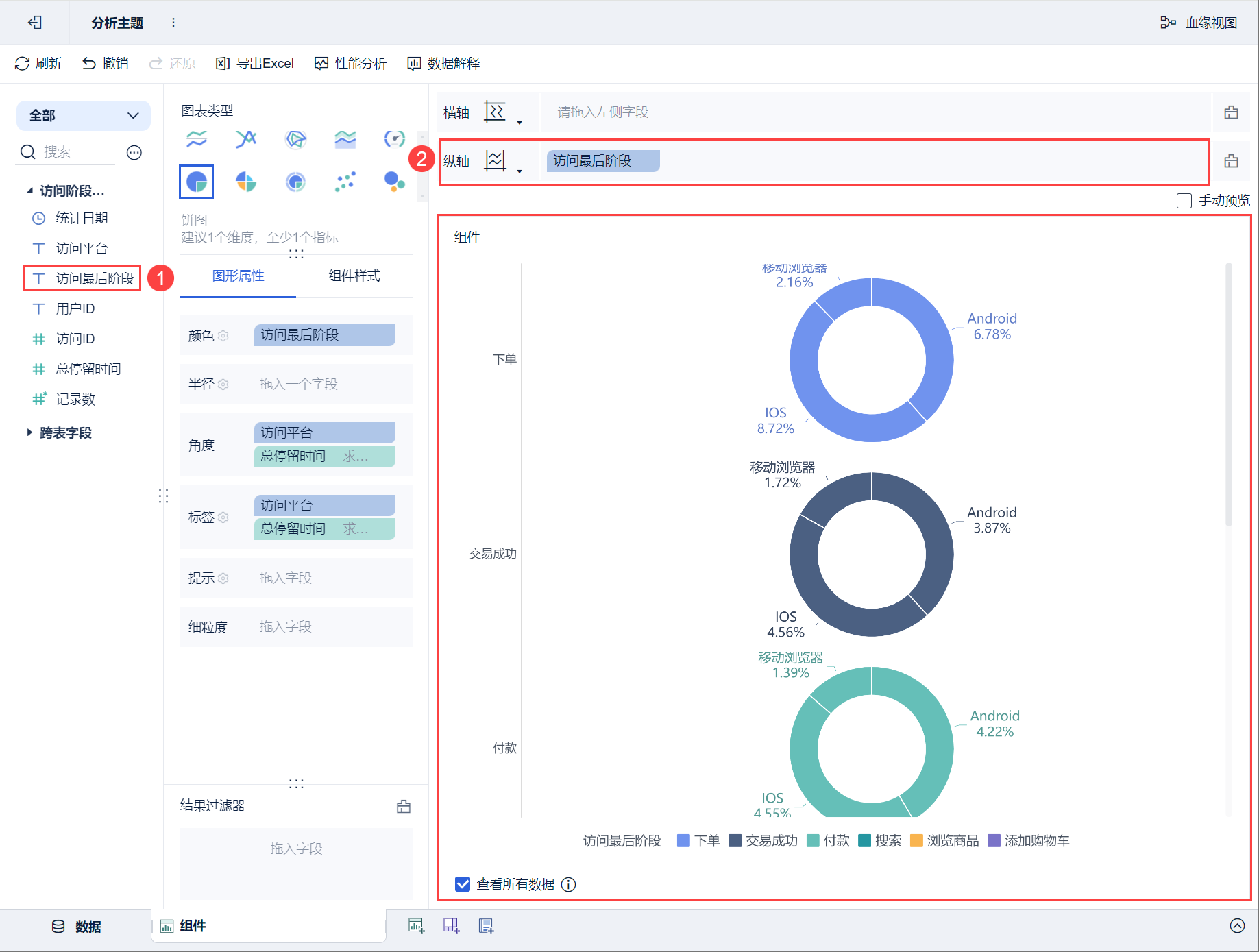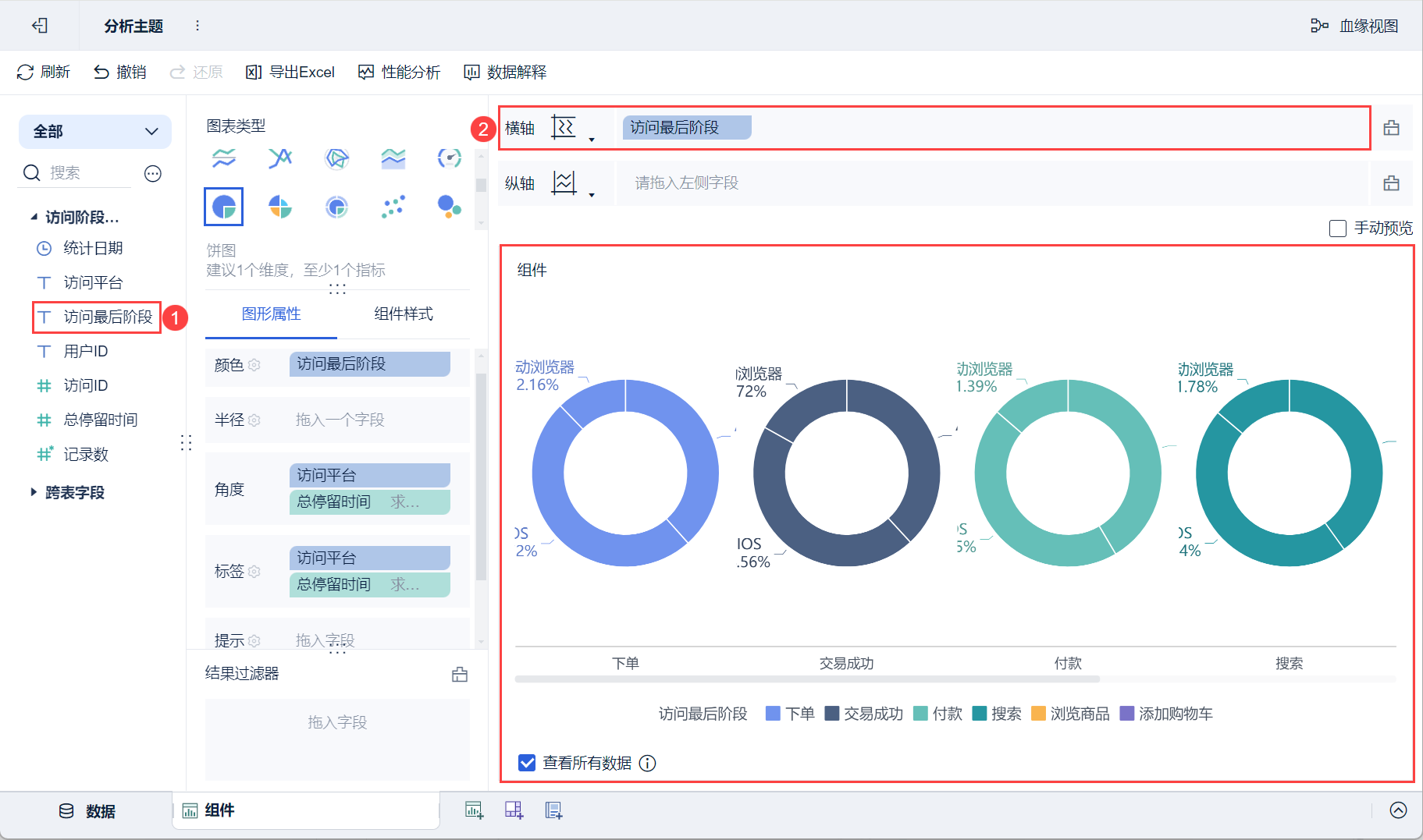 例如,按照「访问最后阶段」查看不同平台的用户浏览时间的变化,将「访问最后阶段」字段拖入横轴或纵轴中。