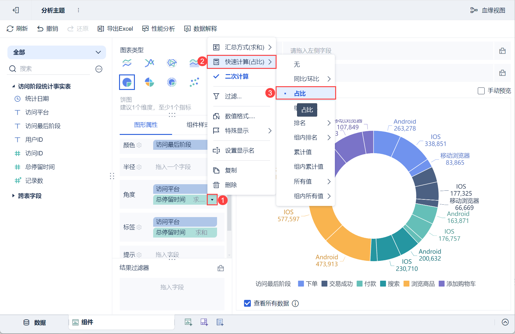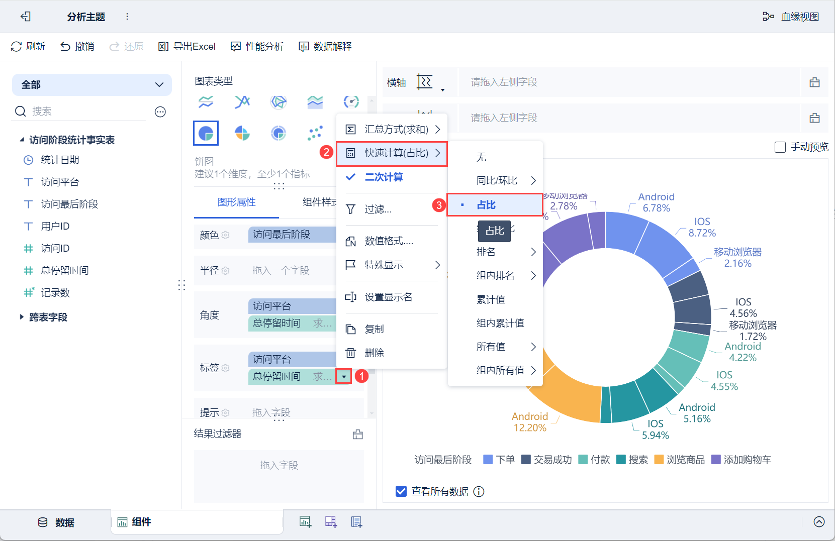 3)将左侧待分析区域的「访问最后阶段」拖入「图形属性」下的颜色栏,「访问平台」、「总停留时间」拖入角度栏和标签栏,如下图所示: