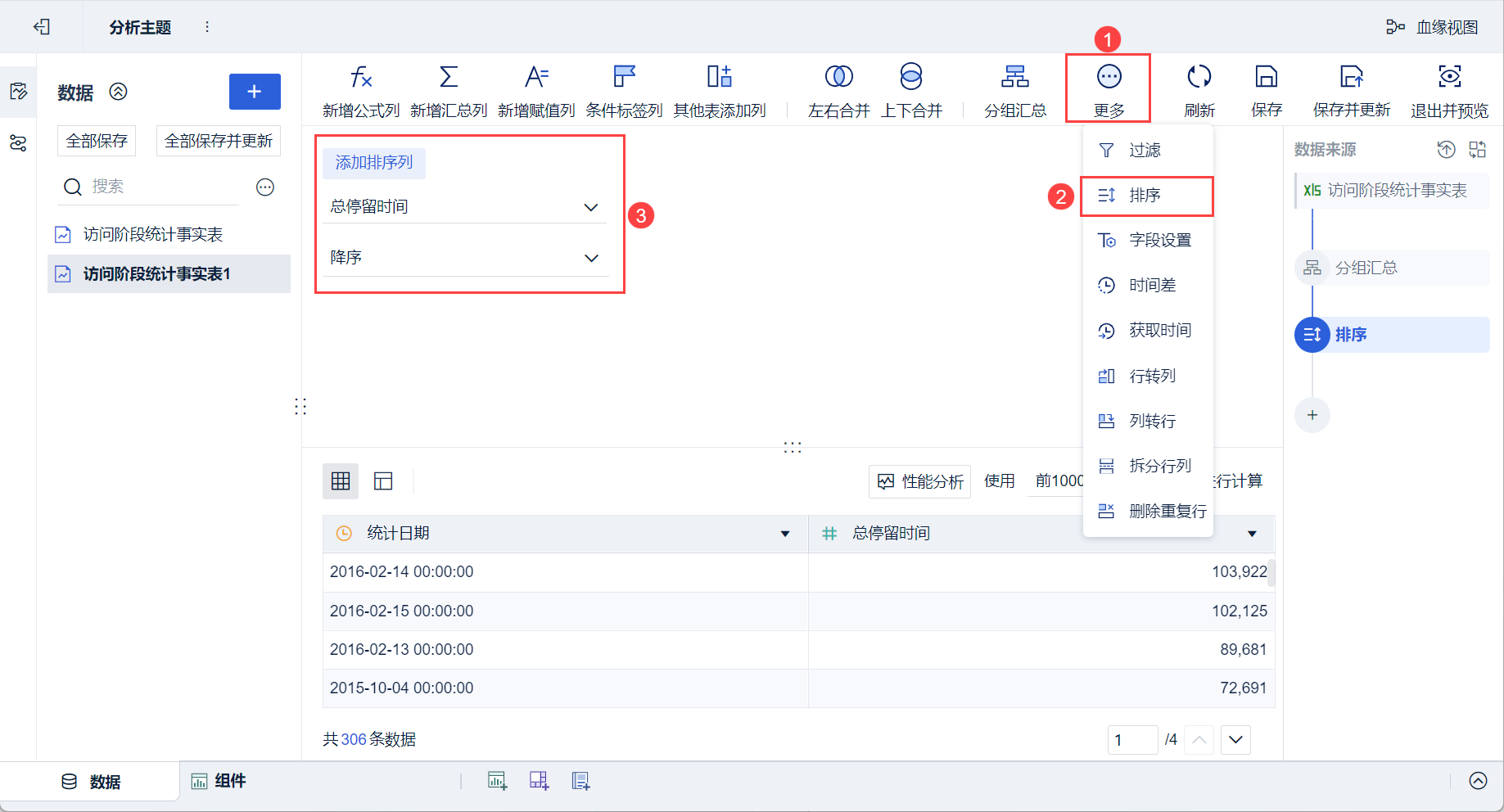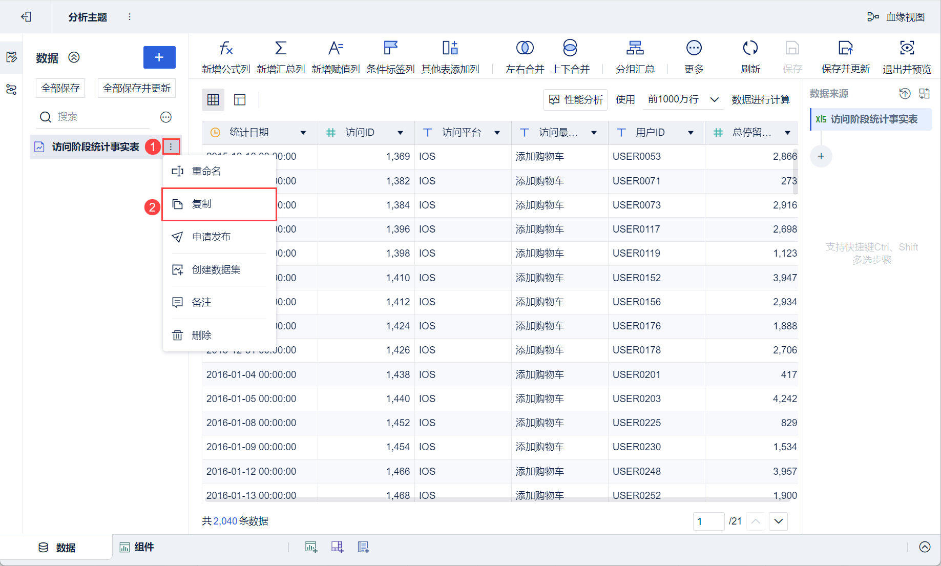 1)在数据编辑界面点击「访问阶段统计事实表」右侧的「⁝」,选择「复制」,复制一份「访问阶段统计事实表」,如下图所示: