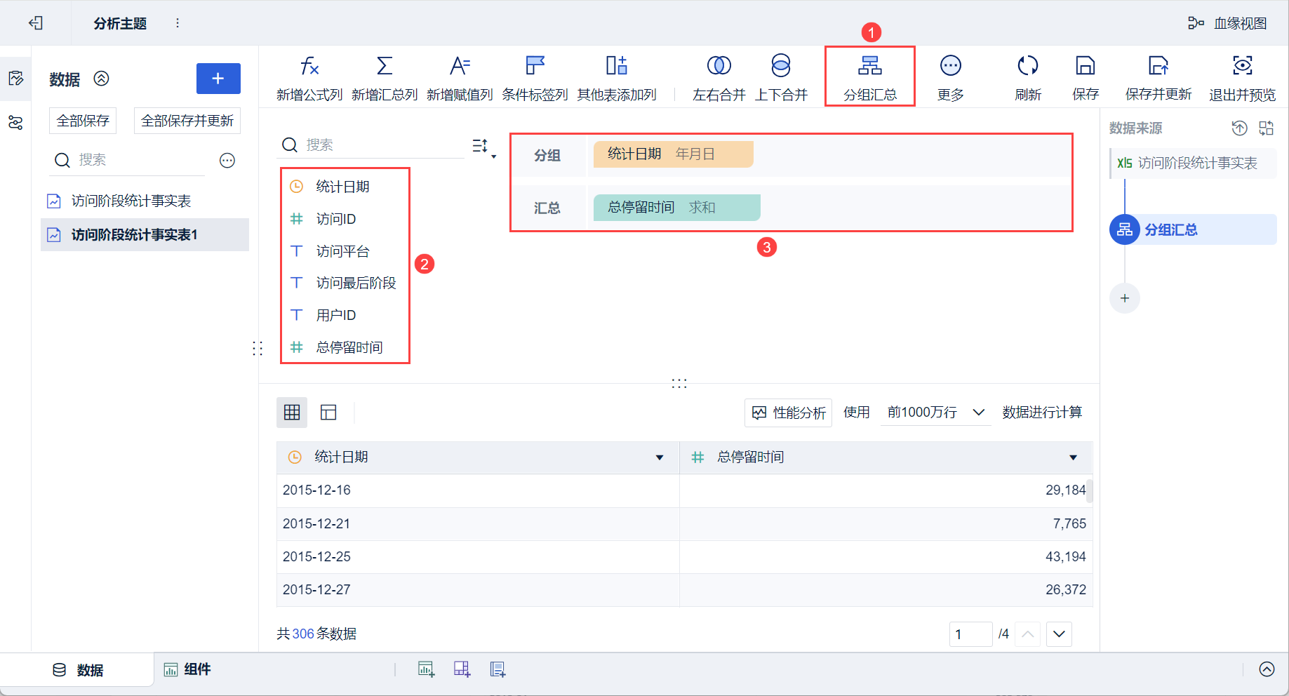 2)在复制的「访问阶段统计事实表1」的数据编辑界面,点击功能栏的「分组汇总」,在弹出的设置框中将「统计日期」拖入分组栏,「总停留时间」拖入汇总栏,即将总停留时间按照日期汇总,如下图所示: