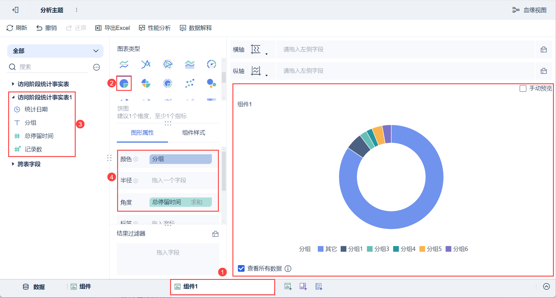3)将左侧待分析区域的「分组」拖入「图形属性」下的颜色栏,「总停留时间」拖入角度栏,后五名合并为其它的饼图生成成功,如下图所示: