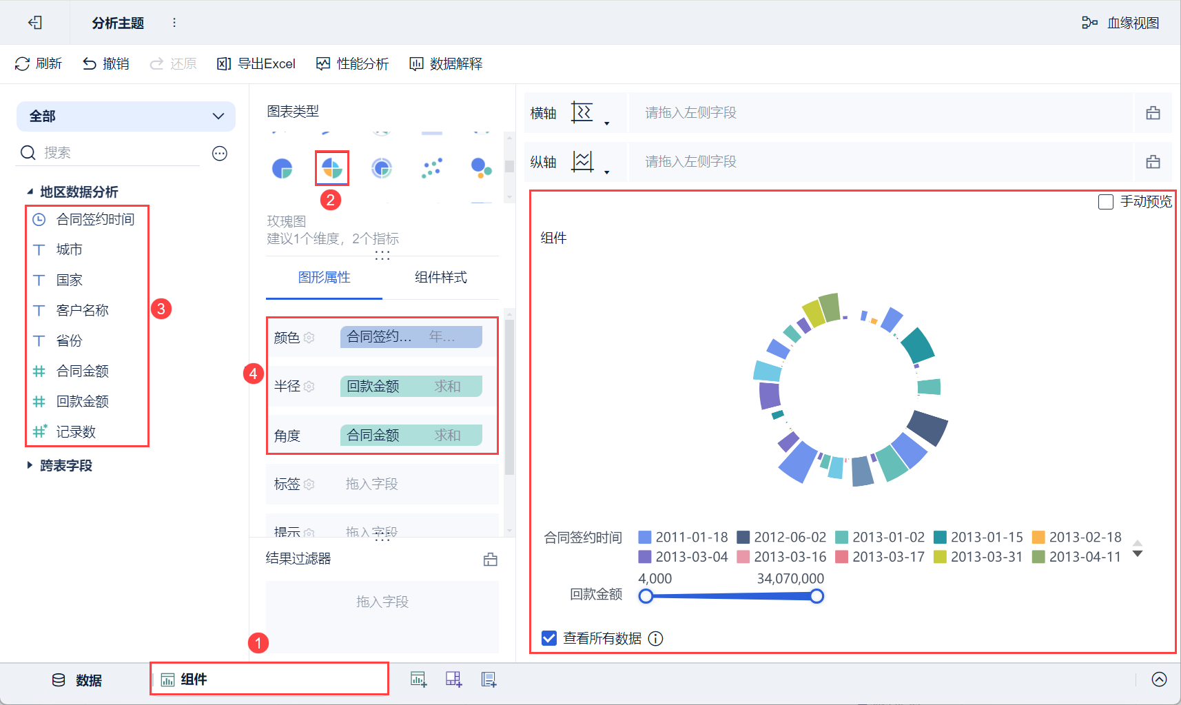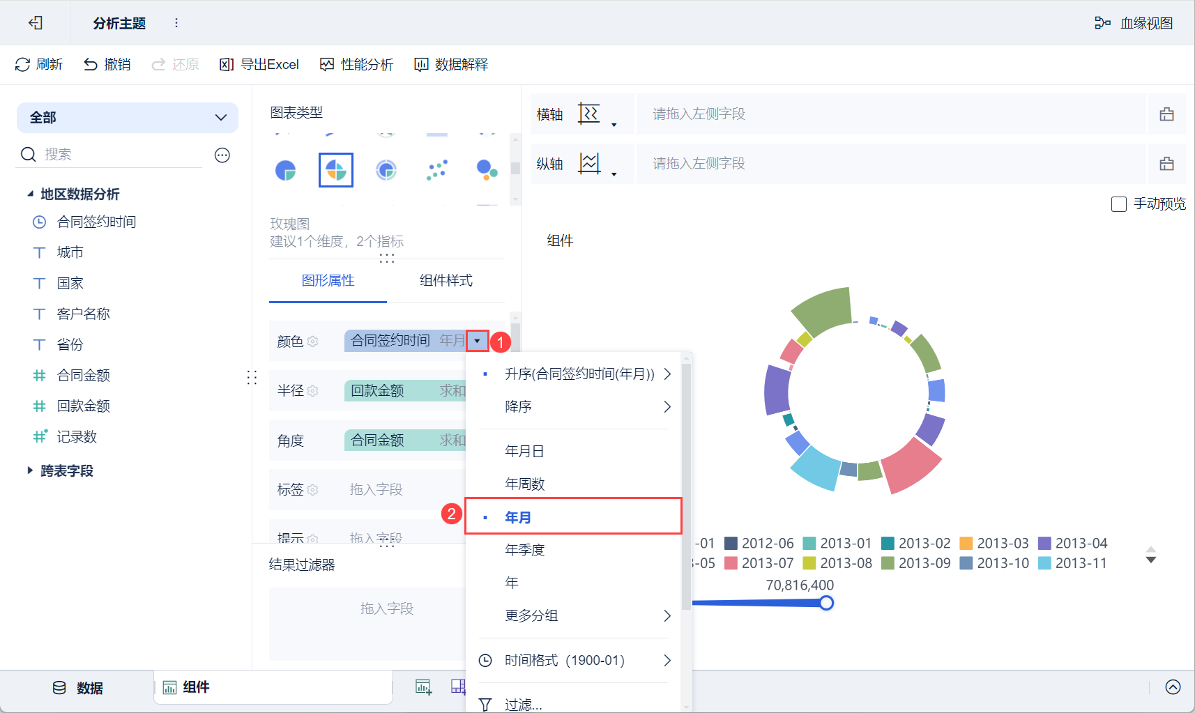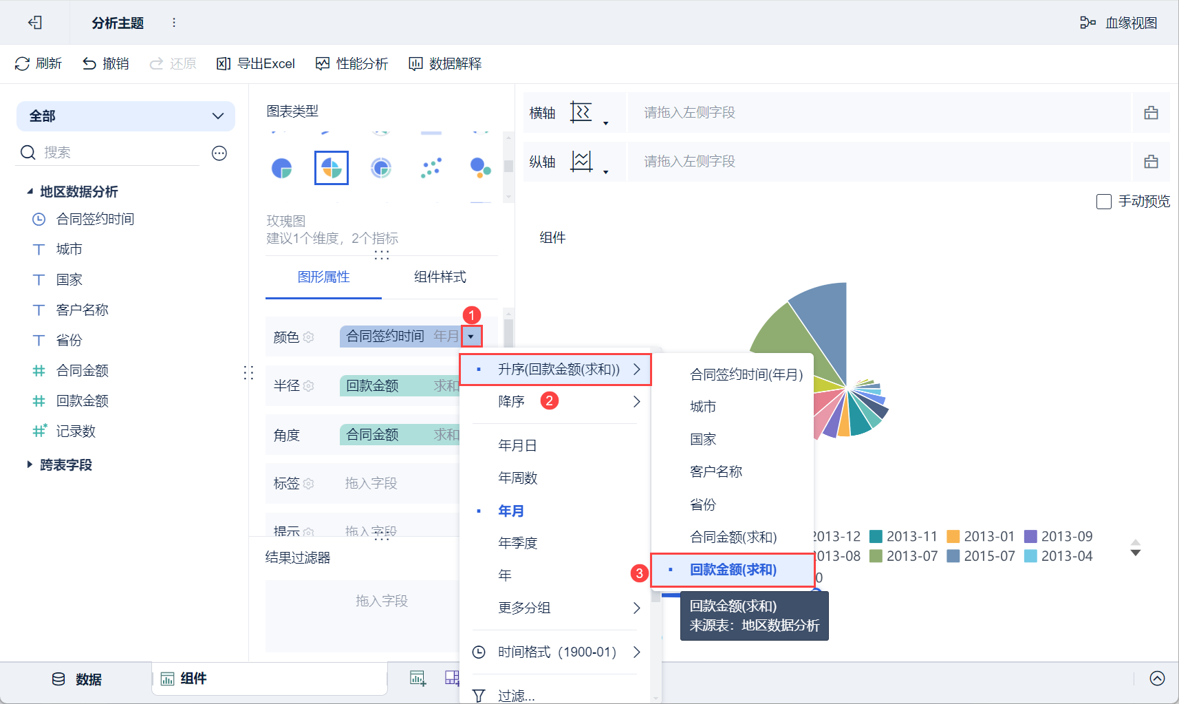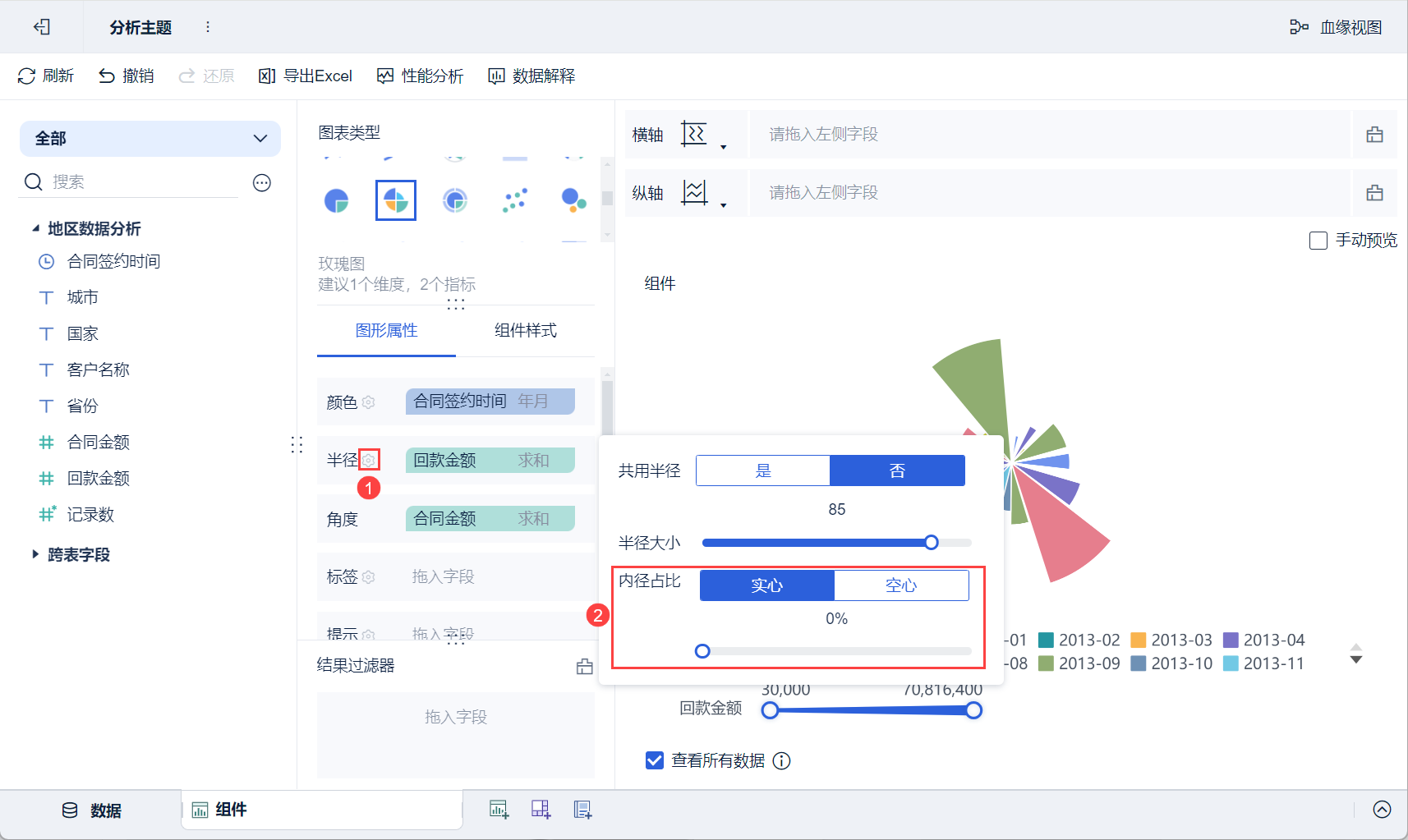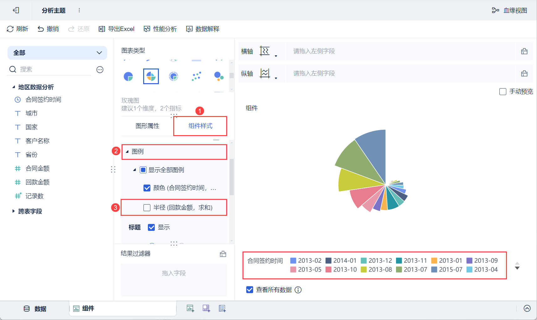 3)将左侧待分析区域的维度字段「合同签约时间」拖入「图形属性」下的颜色栏,「回款金额」拖入半径栏,「合同金额」拖入角度栏,则生成一个玫瑰图。