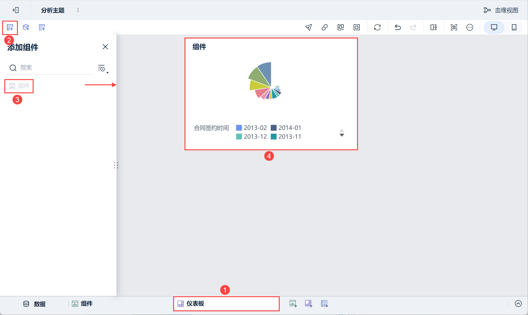 2)进入仪表板编辑界面,将组件拖入至仪表板中,如下图所示: