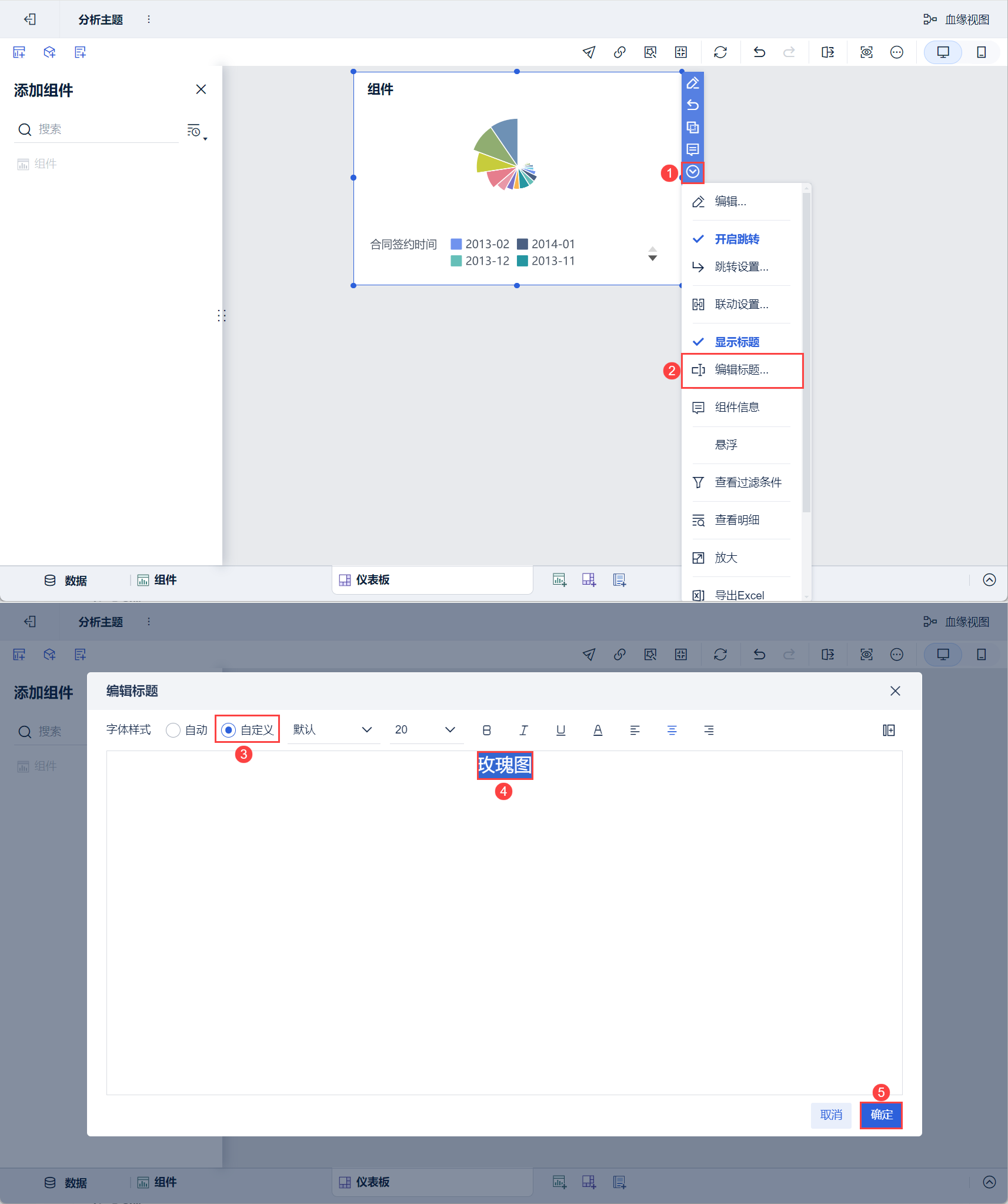 3)下拉选择「编辑标题」,样式选择「自定义」,设置标题为「多层饼图」,点击「确定」。如下图所示: