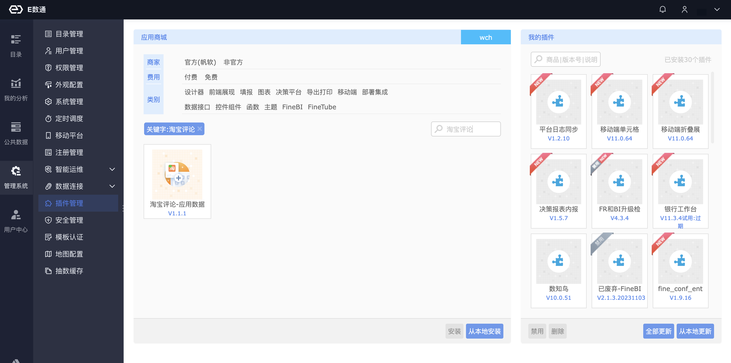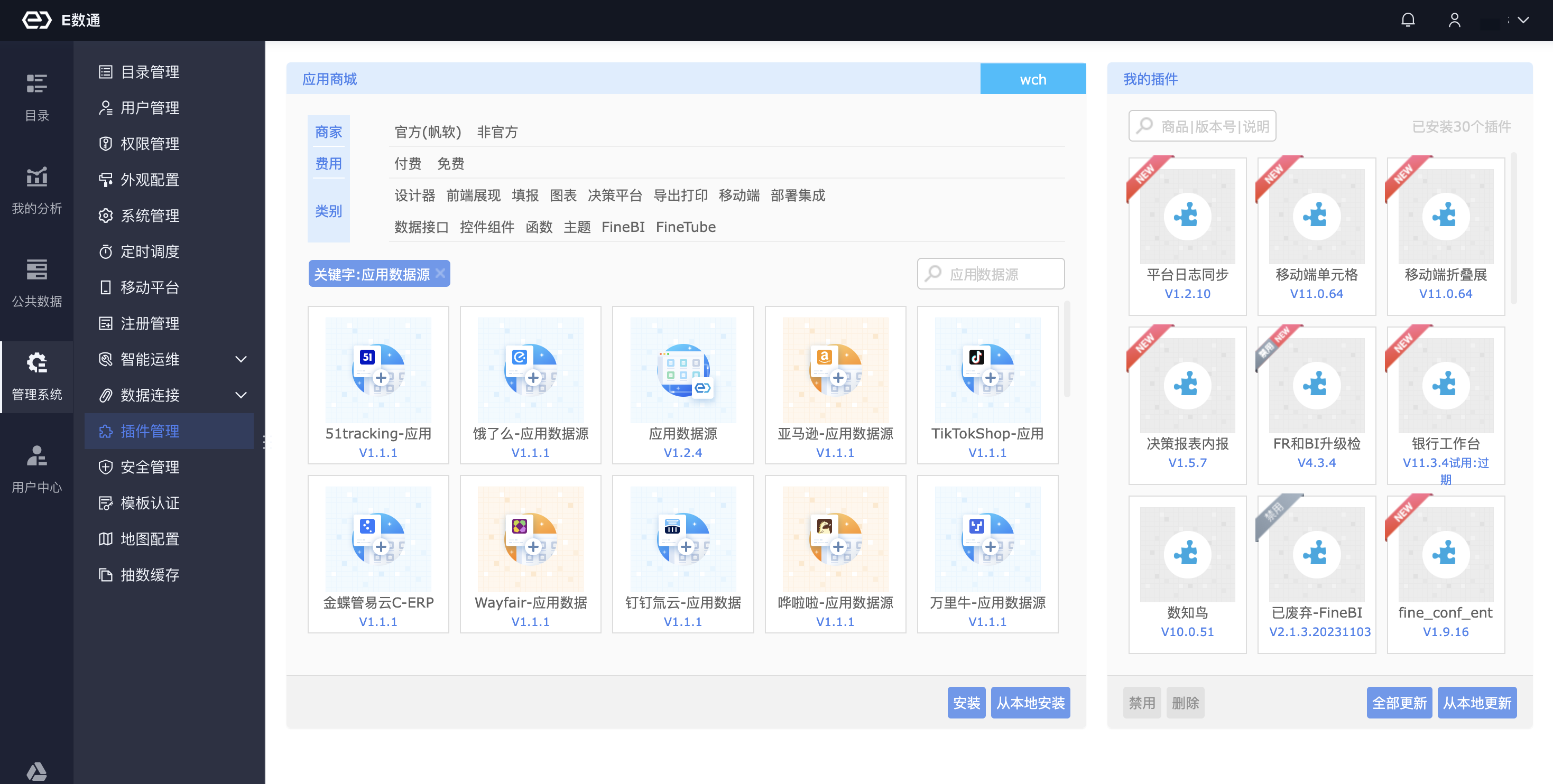 2)安装电商平台插件。不同的电商平台数据,需要安装对应的插件后才可使用。