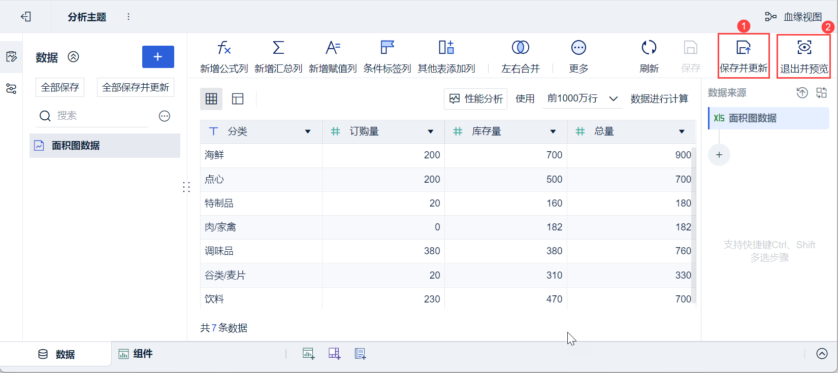 例如,用堆积面积图展示不同分类的商品订购量与库存量是如何构成总量的,如下图所示: