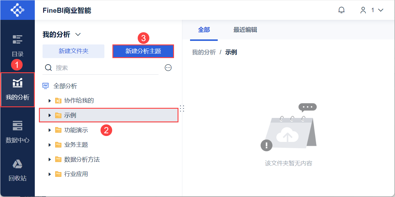 1)用户登录 FineBI 系统,点击「我的分析」,选中某个文件夹,点击「新建分析主题」。如下图所示: